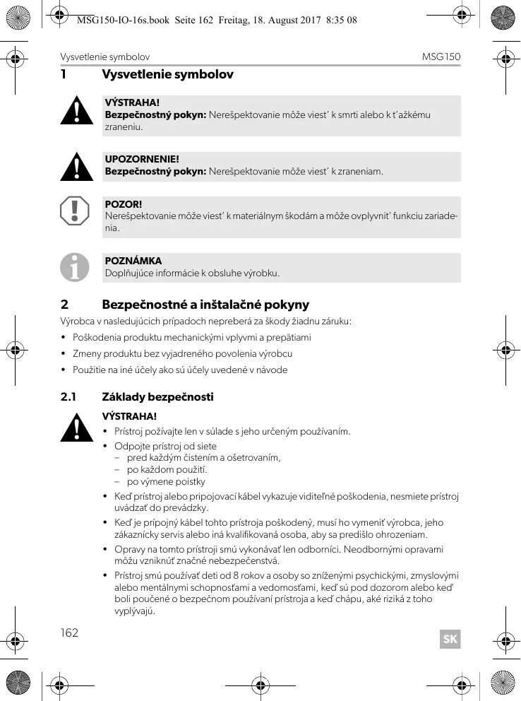 MSG150 Pred montážou a uvedením do prevádzky si prosim pozorne prečítajte tento návod a odložte si ho. V prípade odovzdania výrobku ďalšiemu používateľovi mu odovzdajte aj tento návod.