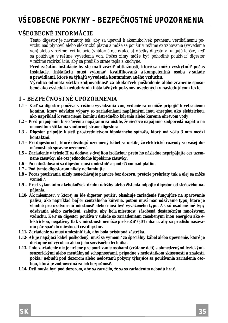 VŠEOBECNÉ POKYNY – BEZPEČNOSTNÉ UPOZORNENIA VŠEOBECNÉ INFORMÁCIE Tento digestor je navrhnutý tak, aby sa upevnil k akémukoľvek pevnému vertikálnemu povrchu nad plynovú alebo elektrickú platňu a môže sa použiť v režime extrahovania (vyvedenie von) alebo v režime recirkulácie (vnútorná recirkulácia) Všetky digestory fungujú lepšie, keď sa používajú v režime vyvedenia von. Počas zimy môže byť pohodlné používať digestor v režime recirkulácie, aby sa predišlo strate tepla z kuchyne. Pred začatím inštalácie by ste mali zvážiť obtiažnosti, ktoré sa môžu vyskytnúť počas inštalácie. Inštaláciu musí vykonať kvalifikovaná a kompetentná osoba v súlade s pravidlami, ktoré sa týkajú vyvedenia kontaminovaného vzduchu. Výrobca odmieta všetku zodpovednosť za akékoľvek poškodenie alebo zranenie spôsobené ako výsledok nedodržania inštalačných pokynov uvedených v nasledujúcom texte.