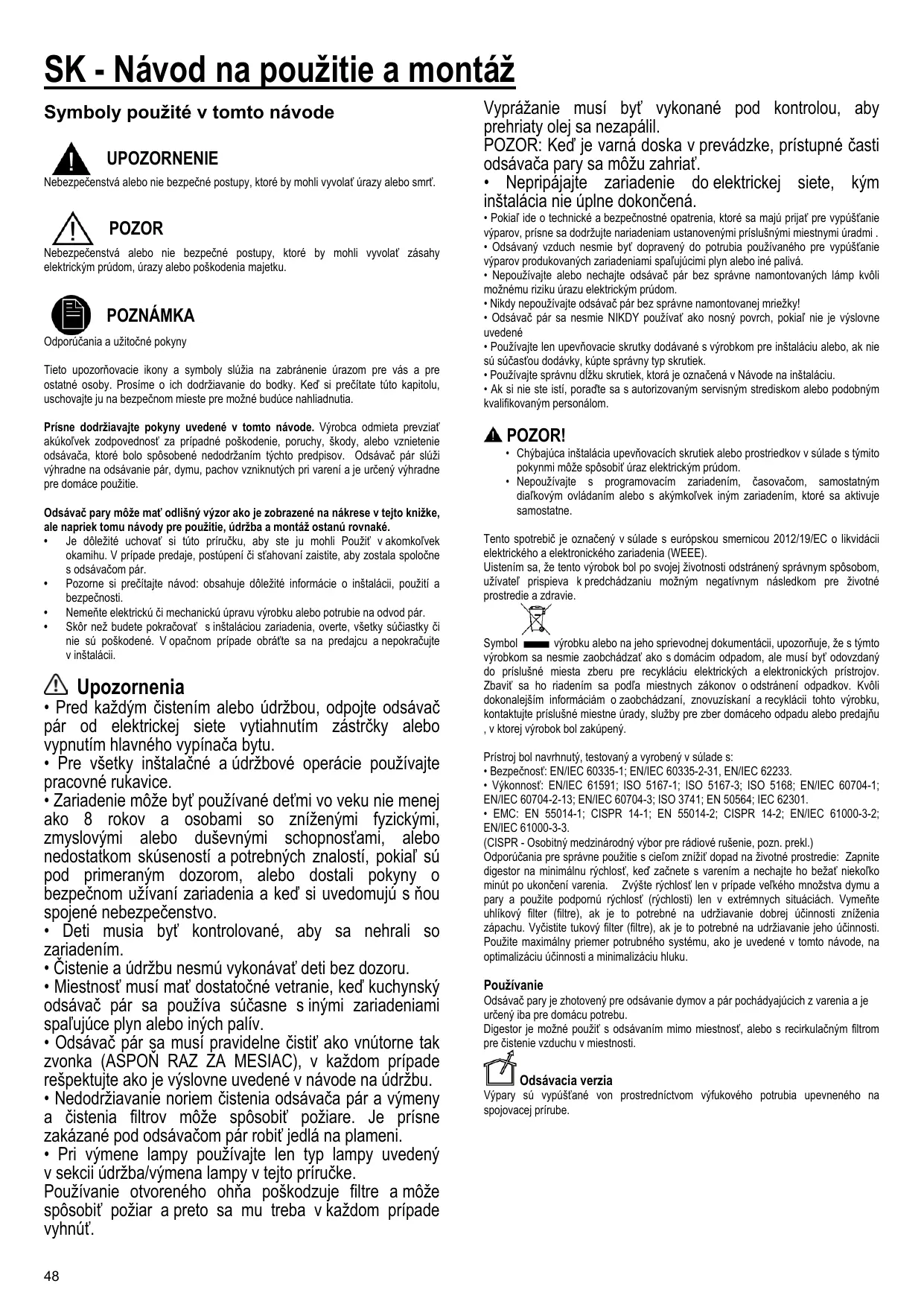 Le symbole indique que ce produit ne peut en aucun cas être traité comme déchet ménager. Il doit par conséquent être remis à un centre de collecte des déchets chargé du recyclage des équipements électriques et électroniques. Pour la mise au rebut, respectez les normes relatives à l’élimination des déchets en vigueur dans le pays d’installation. Pour obtenir de plus amples détails au sujet du traitement, de la récupération et du recyclage de cet appareil, veuillez vous adresser au bureau compétent de votre commune, à la société de collecte des déchets ou directement à votre revendeur. Appareil conçu, testé et fabriqué conformément aux normes suivantes : • Sécurité : EN/IEC 60335-1; EN/IEC 60335-2-31, EN/IEC 62233. • Performances : EN/IEC 61591; ISO 5167-1; ISO 5167-3; ISO 5168; EN/IEC 60704-1; EN/IEC 60704-2-13; EN/IEC 60704-3; ISO 3741; EN 50564; IEC 62301. L’utilisation de tubes et des trous d'évacuation à paroi avec un diamètre inférieur entraînera une diminution des performances d’aspiration et une nette augmentation du bruit. Nous déclinons toute responsabilité à cet égard. ! Utiliser un tuyau de la longueur strictement nécessaire. ! Les coudes du tuyau doivent être en nombre minime (angle maxi du coude: 90°). ! Éviter les variations excessives de section du tuyau.