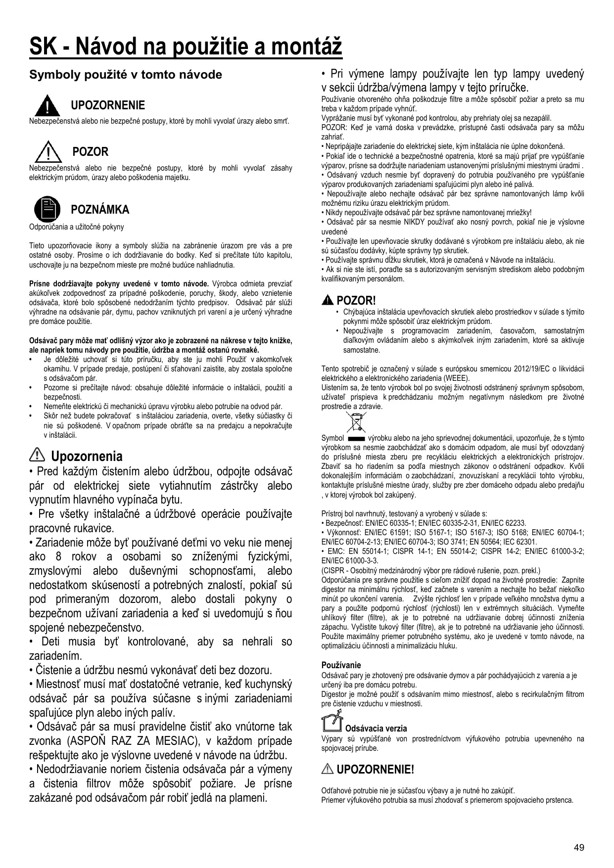 Symbol výrobku alebo na jeho sprievodnej dokumentácii, upozorňuje, že s týmto výrobkom sa nesmie zaobchádzať ako s domácim odpadom, ale musí byť odovzdaný do príslušné miesta zberu pre recykláciu elektrických a elektronických prístrojov. Zbaviť sa ho riadením sa podľa miestnych zákonov o odstránení odpadkov. Kvôli dokonalejším informáciám o zaobchádzaní, znovuzískaní a recyklácii tohto výrobku, kontaktujte príslušné miestne úrady, služby pre zber domáceho odpadu alebo predajňu , v ktorej výrobok bol zakúpený. Prístroj bol navrhnutý, testovaný a vyrobený v súlade s: • Bezpečnosť: EN/IEC 60335-1; EN/IEC 60335-2-31, EN/IEC 62233. • Výkonnosť: EN/IEC 61591; ISO 5167-1; ISO 5167-3; ISO 5168; EN/IEC 60704-1; EN/IEC 60704-2-13; EN/IEC 60704-3; ISO 3741; EN 50564; IEC 62301. • EMC: EN 55014-1; CISPR 14-1; EN 55014-2; CISPR 14-2; EN/IEC 61000-3-2; EN/IEC 61000-3-3. (CISPR - Osobitný medzinárodný výbor pre rádiové rušenie, pozn. prekl.) Odporúčania pre správne použitie s cieľom znížiť dopad na životné prostredie: Zapnite digestor na minimálnu rýchlosť, keď začnete s varením a nechajte ho bežať niekoľko minút po ukončení varenia. Zvýšte rýchlosť len v prípade veľkého množstva dymu a pary a použite podpornú rýchlosť (rýchlosti) len v extrémnych situáciách. Vymeňte uhlíkový filter (filtre), ak je to potrebné na udržiavanie dobrej účinnosti zníženia zápachu. Vyčistite tukový filter (filtre), ak je to potrebné na udržiavanie jeho účinnosti. Použite maximálny priemer potrubného systému, ako je uvedené v tomto návode, na optimalizáciu účinnosti a minimalizáciu hluku.