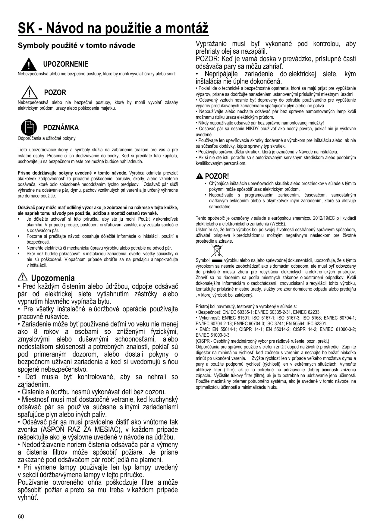 výrobku alebo na jeho sprievodnej dokumentácii, upozorňuje, že s týmto Symbol výrobkom sa nesmie zaobchádzať ako s domácim odpadom, ale musí byť odovzdaný do príslušné miesta zberu pre recykláciu elektrických a elektronických prístrojov. Zbaviť sa ho riadením sa podľa miestnych zákonov o odstránení odpadkov. Kvôli dokonalejším informáciám o zaobchádzaní, znovuzískaní a recyklácii tohto výrobku, kontaktujte príslušné miestne úrady, služby pre zber domáceho odpadu alebo predajňu , v ktorej výrobok bol zakúpený. Prístroj bol navrhnutý, testovaný a vyrobený v súlade s: • Bezpečnosť: EN/IEC 60335-1; EN/IEC 60335-2-31, EN/IEC 62233. • Výkonnosť: EN/IEC 61591; ISO 5167-1; ISO 5167-3; ISO 5168; EN/IEC 60704-1; EN/IEC 60704-2-13; EN/IEC 60704-3; ISO 3741; EN 50564; IEC 62301. • EMC: EN 55014-1; CISPR 14-1; EN 55014-2; CISPR 14-2; EN/IEC 61000-3-2; EN/IEC 61000-3-3. (CISPR - Osobitný medzinárodný výbor pre rádiové rušenie, pozn. prekl.) Odporúčania pre správne použitie s cieľom znížiť dopad na životné prostredie: Zapnite digestor na minimálnu rýchlosť, keď začnete s varením a nechajte ho bežať niekoľko minút po ukončení varenia. Zvýšte rýchlosť len v prípade veľkého množstva dymu a pary a použite podpornú rýchlosť (rýchlosti) len v extrémnych situáciách. Vymeňte uhlíkový filter (filtre), ak je to potrebné na udržiavanie dobrej účinnosti zníženia zápachu. Vyčistite tukový filter (filtre), ak je to potrebné na udržiavanie jeho účinnosti. Použite maximálny priemer potrubného systému, ako je uvedené v tomto návode, na optimalizáciu účinnosti a minimalizáciu hluku.