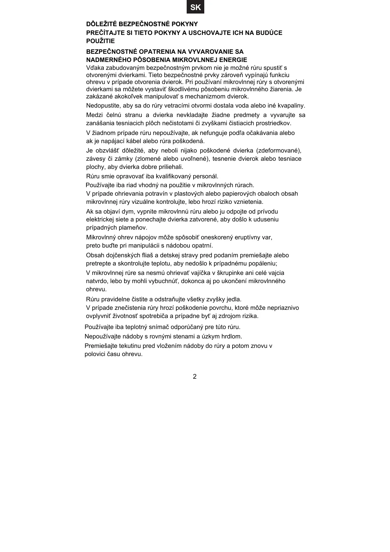 Po skončení ohrevu ponechajte nádobu krátko stáť v rúre. Premiešajte a pretrepte obsah (najmä dojčenských fliaš a dojčenskej stravy) a pred použitím dôkladne skontrolujte teplotu. Mikrovlnnú rúru neumiestňujte do skrine, ak na tento účel nebola testovaná. Prístroj nie je určený na ovládanie pomocou externého časovača ani pomocou samostatného systému diaľkového ovládania. Prístroj je určený iba na domáce použitie a nesmie sa používať na žiadne iné účely. Akékoľvek iné použitie môže mať za následok zrušenie platnosti záruky a môže byť nebezpečné. Spotrebič nie je určený na používanie osobami (vrátane detí) s obmedzenými fyzickými, zmyslovými alebo duševnými schopnosťami alebo nedostatkom skúseností a znalostí, ak tieto osoby nie sú pod dohľadom alebo nie sú riadne poučené, čo sa týka použitia spotrebiča zo strany osoby zodpovednej za ich bezpečnosť. Deti musia byť pod dozorom, aby sa nehrali so spotrebičom. Aby sa predišlo riziku, poškodený sieťový kábel musí vymeniť výrobca, servisný technik či iná kvalifikovaná osoba. VAROVANIE: MIKROVLNNÁ ENERGIA. NEODSTRAŇUJTE TENTO KRYT. VAROVANIE: Prístroj a jeho prístupné časti sa počas používania zahrievajú. Vyvarujte sa dotyku ohrievacích telies rúry. Deti mladšie ako 8 rokov smú byť v blízkosti rúry, iba ak sú pod trvalým dohľadom. VAROVANIE: V prípade poškodenia dvierok alebo ich tesnenia, nepoužívajte mikrovlnnú rúru, kým nie je opravená odborníkom. VAROVANIE: Akékoľvek servisné alebo iné zásahy, v rámci ktorých je nutné odobrať kryt chrániaci pred mikrovlnným žiarením, smie vykonávať iba oprávnená osoba. VAROVANIE: Tekutiny a iné potraviny neohrievajte v uzatvorených nádobách, môže dôjsť k ich výbuchu. VAROVANIE: Deti smú mikrovlnnú rúru používať bez dozoru iba v prípade, že boli riadne poučené a sú schopné používať mikrovlnnú rúru bezpečným spôsobom a chápať nebezpečenstvo nesprávneho použitia. VAROVANIE: Pred výmenou lampy sa uistite, že je prístroj vypnutý, aby sa zabránilo úrazu elektrickým prúdom.