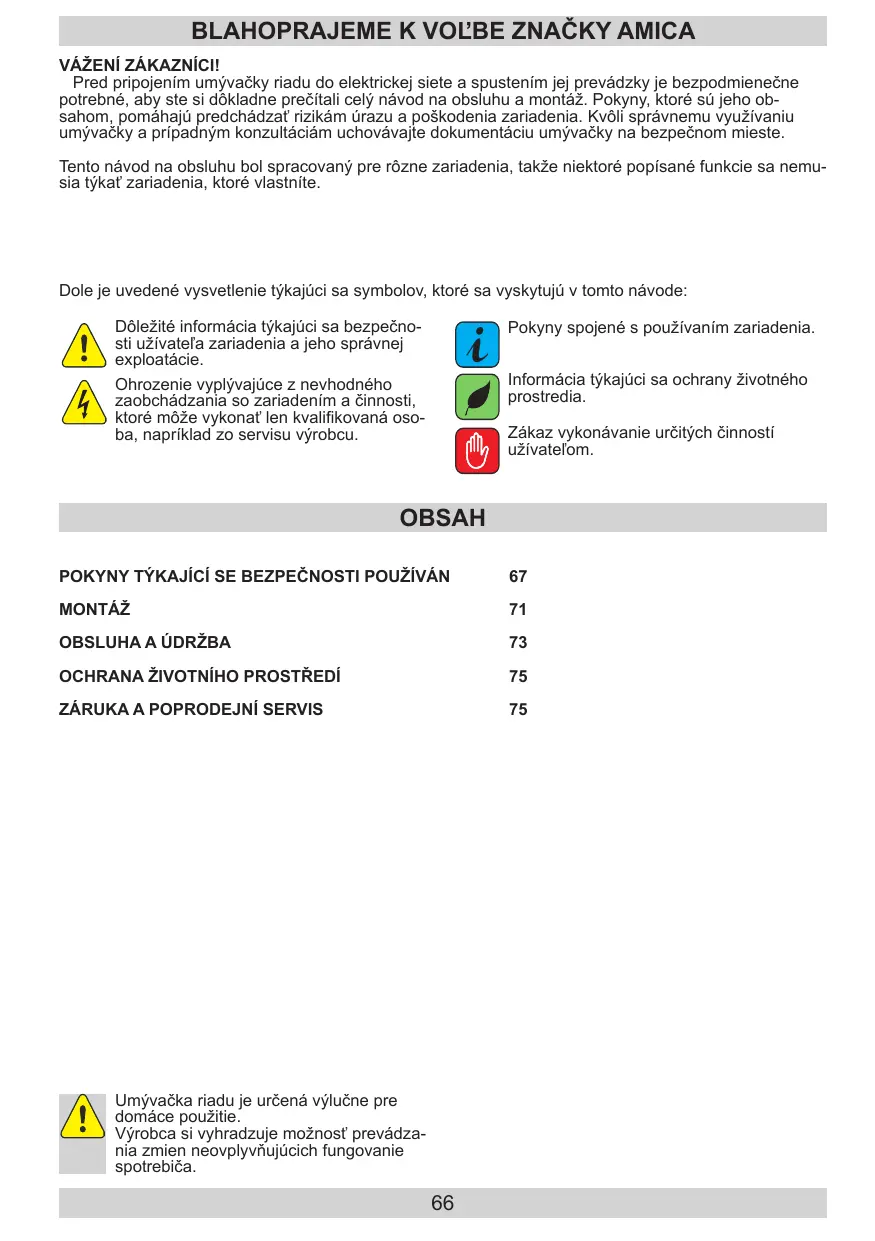 BLAHOPRAJEME K VOĽBE ZNAČKY AMICA VÁŽENÍ ZÁKAZNÍCI! Pred pripojením umývačky riadu do elektrickej siete a spustením jej prevádzky je bezpodmienečne potrebné, aby ste si dôkladne prečítali celý návod na obsluhu a montáž. Pokyny, ktoré sú jeho obsahom, pomáhajú predchádzať rizikám úrazu a poškodenia zariadenia. Kvôli správnemu využívaniu umývačky a prípadným konzultáciám uchovávajte dokumentáciu umývačky na bezpečnom mieste. Tento návod na obsluhu bol spracovaný pre rôzne zariadenia, takže niektoré popísané funkcie sa nemusia týkať zariadenia, ktoré vlastníte. Dole je uvedené vysvetlenie týkajúci sa symbolov, ktoré sa vyskytujú v tomto návode: Dôležité informácia týkajúci sa bezpečnosti užívateľa zariadenia a jeho správnej exploatácie. Ohrozenie vyplývajúce z nevhodného zaobchádzania so zariadením a činnosti, ktoré môže vykonať len kvalifikovaná osoba, napríklad zo servisu výrobcu.