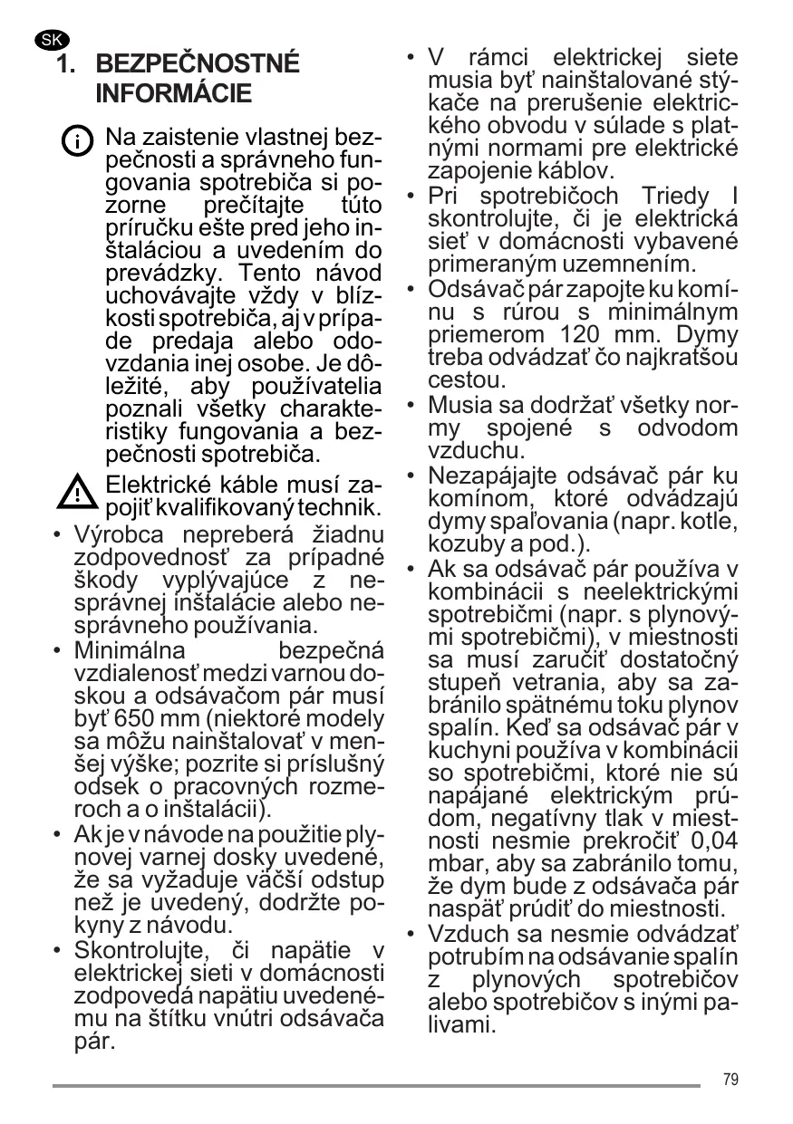 1. SICHERHEITSINFORMA TIONEN Lesen Sie bitte für Ihre eigene Sicherheit und die korrekte Funktion des Geräts diese Betriebsanleitung sorgfältig durch, bevor Sie es installieren und in Betrieb nehmen. Bewahren Sie die Betriebsanleitung stets zusammen mit dem Gerät auf, auch falls Sie dieses verkaufen oder Dritten überlassen. Es ist wichtig, dass die Benutzer mit allen Funktionsund Sicherheitsmerkmalen des Gerätes vertraut sind. Die Kabel müssen von kompetentem Fachpersonal angeschlossen werden. • En aucun cas le fabricant ne peut être tenu pour responsable de dommages éventuellement dus à une installation ou à une utilisation impropre. • La distance de sécurité minimum entre la table de cuisson et la hotte aspirante est de 650 mm (certains modèles peuvent être installés à une hauteur inférieure ; voir le paragraphe concernant les dimensions de travail et l’installation). • Si les instructions d’installation de la table de cuisson à gaz spécifient une distance supérieure à celle indiquée ci-