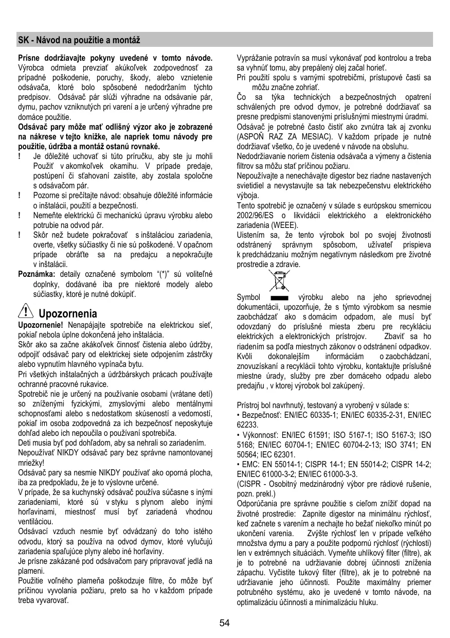 Prisne dodržiavajtePokyny uvedené v totom návode. Vyrobca odmieta prevziaf akukolvek zodpovednost za pripadné poskodenie, poruchy, skody, alebo vznietenie odašača, ktoré bolosposobene nedodržanim tychto predispísov. Odašač pár slúžvihyradne na odašavanie pár, dymu, pachov vzniknutych pri vareni a je určený vyhradne pre domáce použitie.