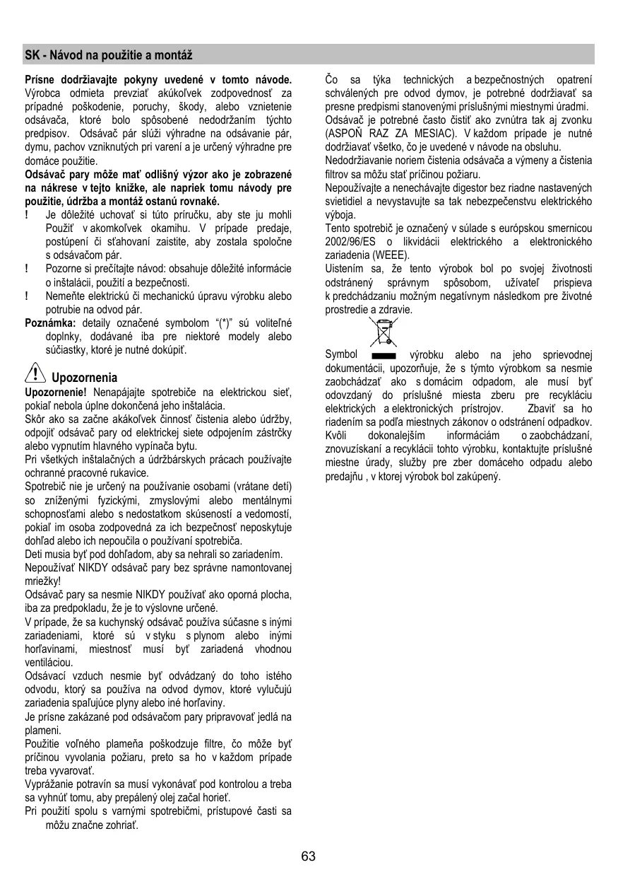 SK - Návod na použitie a montáž Čo sa týka technických a bezpečnostných opatrení schválených pre odvod dymov, je potrebné dodržiavať sa presne predpismi stanovenými príslušnými miestnymi úradmi. Odsávač je potrebné často čistiť ako zvnútra tak aj zvonku (ASPOŇ RAZ ZA MESIAC). V každom prípade je nutné dodržiavať všetko, čo je uvedené v návode na obsluhu. Nedodržiavanie noriem čistenia odsávača a výmeny a čistenia filtrov sa môžu stať príčinou požiaru. Nepoužívajte a nenechávajte digestor bez riadne nastavených svietidiel a nevystavujte sa tak nebezpečenstvu elektrického výboja. Tento spotrebič je označený v súlade s európskou smernicou 2002/96/ES o likvidácii elektrického a elektronického zariadenia (WEEE). Uistením sa, že tento výrobok bol po svojej životnosti odstránený správnym spôsobom, užívateľ prispieva k predchádzaniu možným negatívnym následkom pre životné prostredie a zdravie. Prísne dodržiavajte pokyny uvedené v tomto návode. Výrobca odmieta prevziať akúkoľvek zodpovednosť za prípadné poškodenie, poruchy, škody, alebo vznietenie odsávača, ktoré bolo spôsobené nedodržaním týchto predpisov. Odsávač pár slúži výhradne na odsávanie pár, dymu, pachov vzniknutých pri varení a je určený výhradne pre domáce použitie. Odsávač pary môže mať odlišný výzor ako je zobrazené na nákrese v tejto knižke, ale napriek tomu návody pre použitie, údržba a montáž ostanú rovnaké. Je dôležité uchovať si túto príručku, aby ste ju mohli Použiť v akomkoľvek okamihu. V prípade predaje, postúpení či sťahovaní zaistite, aby zostala spoločne s odsávačom pár. Pozorne si prečítajte návod: obsahuje dôležité informácie o inštalácii, použití a bezpečnosti. Nemeňte elektrickú či mechanickú úpravu výrobku alebo potrubie na odvod pár. Poznámka: detaily označené symbolom “(*)” sú voliteľné doplnky, dodávané iba pre niektoré modely alebo súčiastky, ktoré je nutné dokúpiť. Symbol výrobku alebo na jeho sprievodnej dokumentácii, upozorňuje, že s týmto výrobkom sa nesmie zaobchádzať ako s domácim odpadom, ale musí byť odovzdaný do príslušné miesta zberu pre recykláciu elektrických a elektronických prístrojov. Zbaviť sa ho riadením sa podľa miestnych zákonov o odstránení odpadkov. Kvôli dokonalejším informáciám o zaobchádzaní, znovuzískaní a recyklácii tohto výrobku, kontaktujte príslušné miestne úrady, služby pre zber domáceho odpadu alebo predajňu , v ktorej výrobok bol zakúpený. Upozornenia Upozornenie! Nenapájajte spotrebiče na elektrickou sieť, pokiaľ nebola úplne dokončená jeho inštalácia. Skôr ako sa začne akákoľvek činnosť čistenia alebo údržby, odpojiť odsávač pary od elektrickej siete odpojením zástrčky alebo vypnutím hlavného vypínača bytu. Pri všetkých inštalačných a údržbárskych prácach používajte ochranné pracovné rukavice. Spotrebič nie je určený na používanie osobami (vrátane detí) so zníženými fyzickými, zmyslovými alebo mentálnymi schopnosťami alebo s nedostatkom skúseností a vedomostí, pokiaľ im osoba zodpovedná za ich bezpečnosť neposkytuje dohľad alebo ich nepoučila o používaní spotrebiča. Deti musia byť pod dohľadom, aby sa nehrali so zariadením. Nepoužívať NIKDY odsávač pary bez správne namontovanej mriežky! Odsávač pary sa nesmie NIKDY používať ako oporná plocha, iba za predpokladu, že je to výslovne určené. V prípade, že sa kuchynský odsávač používa súčasne s inými zariadeniami, ktoré sú v styku s plynom alebo inými horľavinami, miestnosť musí byť zariadená vhodnou ventiláciou. Odsávací vzduch nesmie byť odvádzaný do toho istého odvodu, ktorý sa používa na odvod dymov, ktoré vylučujú zariadenia spaľujúce plyny alebo iné horľaviny. Je prísne zakázané pod odsávačom pary pripravovať jedlá na plameni. Použitie voľného plameňa poškodzuje filtre, čo môže byť príčinou vyvolania požiaru, preto sa ho v každom prípade treba vyvarovať. Vyprážanie potravín sa musí vykonávať pod kontrolou a treba sa vyhnúť tomu, aby prepálený olej začal horieť. Pri použití spolu s varnými spotrebičmi, prístupové časti sa môžu značne zohriať.