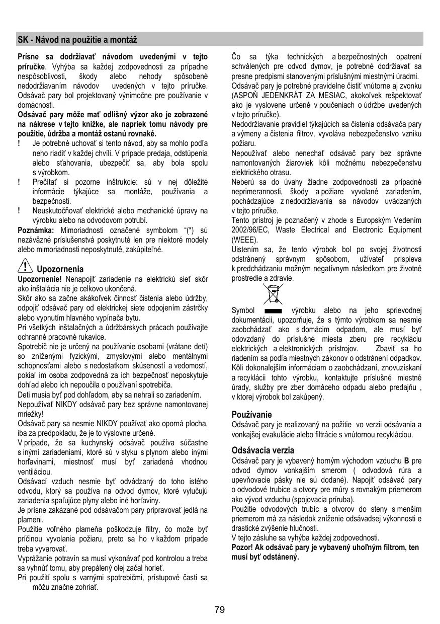 En ce qui concerne les mesures techniques et de sécurité à adopter pour l’évacuation des fumées, s’en tenir strictement à ce qui est prévu dans les règlements des autorités locales compétentes. La hotte doit être régulièrement nettoyée, aussi bien à l’intérieur qu’à l’extérieur (AU MOINS UNE FOIS PAR MOIS, respecter néanmoins les instructions relatives à l’entretien fournies dans ce manuel). La non observation de ces normes de nettoyage de la hotte et du changement et nettoyage des filtres comporte des risques d’incendie. Ne pas utiliser ou laisser la hotte sans que les ampoules soient correctement placées pour éviter tout risque de choc électrique. La société décline toute responsabilité pour d’éventuels inconvénients, dégâts ou incendies provoqués par l’appareil et dérivés de la non observation des instructions reprises dans ce manuel. Cet appareil porte le symbole du recyclage conformément à la Directive Européenne 2002/96/CE concernant les Déchets d’Équipements Électriques et Électroniques (DEEE ou WEEE). En procédant correctement à la mise au rebut de cet appareil, vous contribuerez à empêcher toute conséquence nuisible pour l’environnement et la santé de l’homme.