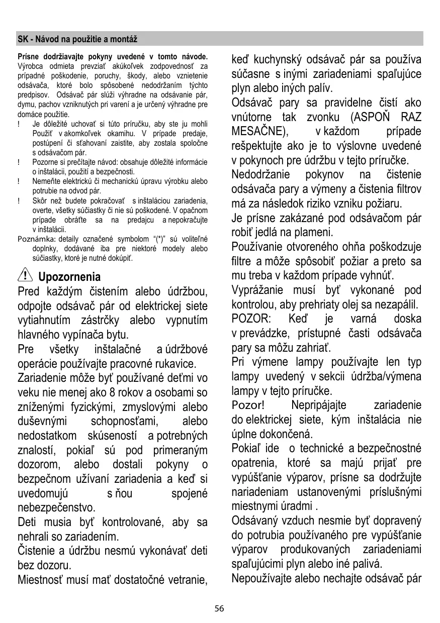 Prísne dodržiavajte pokyny uvedené v tomto návode. Výrobca odmieta prevziať akúkoľvek zodpovednosť za prípadné poškodenie, poruchy, škody, alebo vznietenie odsávača, ktoré bolo spôsobené nedodržaním týchto predpisov. Odsávač pár slúži výhradne na odsávanie pár, dymu, pachov vzniknutých pri varení a je určený výhradne pre domáce použitie. ! Je dôležité uchovať si túto príručku, aby ste ju mohli Použiť v akomkoľvek okamihu. V prípade predaje, postúpení či sťahovaní zaistite, aby zostala spoločne s odsávačom pár. ! Pozorne si prečítajte návod: obsahuje dôležité informácie o inštalácii, použití a bezpečnosti. ! Nemeňte elektrickú či mechanickú úpravu výrobku alebo potrubie na odvod pár. ! Skôr než budete pokračovať s inštaláciou zariadenia, overte, všetky súčiastky či nie sú poškodené. V opačnom prípade obráťte sa na predajcu a nepokračujte v inštalácii. Poznámka: detaily označené symbolom “(*)” sú voliteľné doplnky, dodávané iba pre niektoré modely alebo súčiastky, ktoré je nutné dokúpiť.