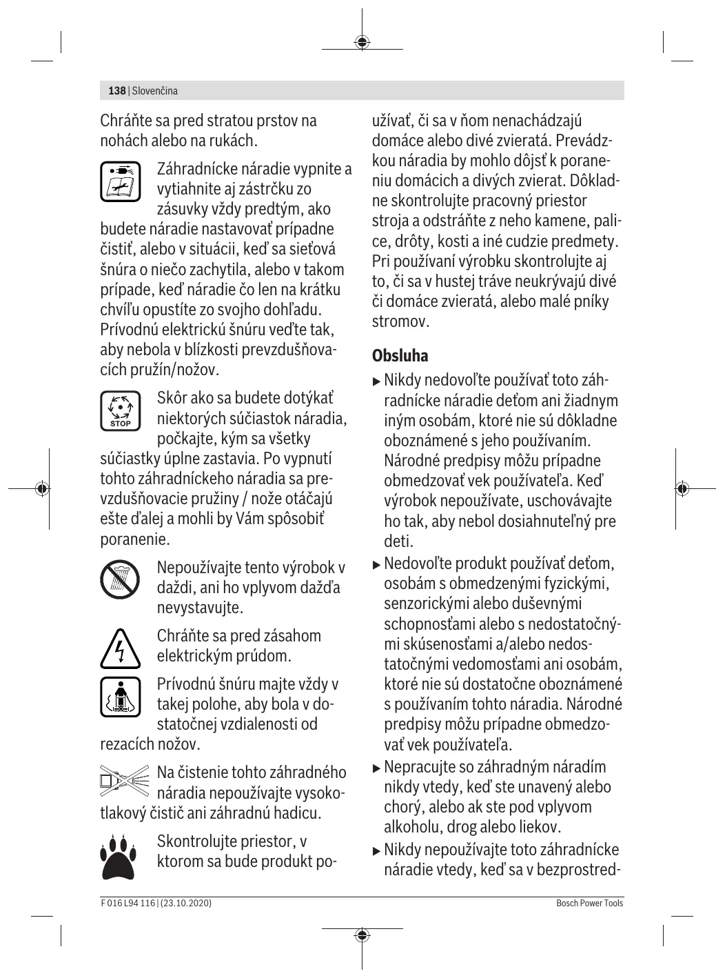 Instrucciones de seguridad ¡Atención! Lea detenidamente las siguientes instrucciones. Familiarícese con los elementos de manejo y el uso reglamentario del producto. Preste atención a que no sean lesionadas por cuerpos extraños proyectados las personas situadas cerca. Advertencia: Mantenga una separación de seguridad respecto al producto en funcionamiento. Atención: No toque las cuchillas en funcionamiento. Las cuchillas están muy afiladas. Tenga cuidado de no cercenarse los dedos de los pies y de las manos. Desconecte el aparato para jardín y saque el enchufe de la red antes de realizar un ajuste, al limpiarlo, si se hubiese enganchado el cable, o siempre que deje desatendido el aparato para jardín, incluso durante un tiempo breve. Mantenga alejado el cable de red de las púas/cuchillas. Espere a que todas las piezas del aparato para jardín se hayan detenido por completo antes de tocarlas. Al desconectar el F 016 L94 116 | (23.10.2020)