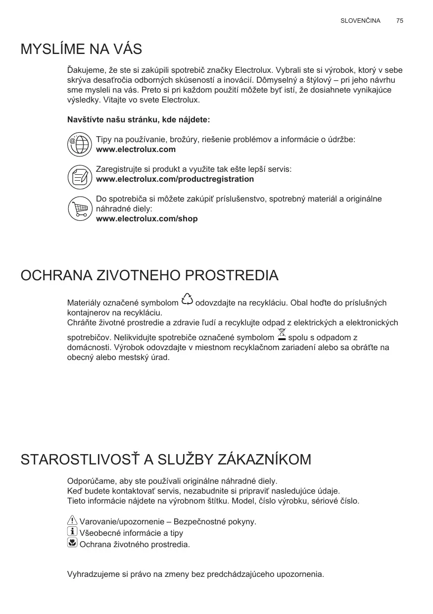 Dakujeme, ze ste si zakupili spotrebič značky Electrolux. Vybrali ste si vyrobok, ktorý v sebe skryva desa tročica odbornych skuseností a inovácić. Dómyselný a štylový - pri jeho návrhu sme mysleli na vás. Preto si pri každom použití možete byt'istí, ze dosiahnete vynikajúce vysledky. Vitaje vo svete Electrolux.