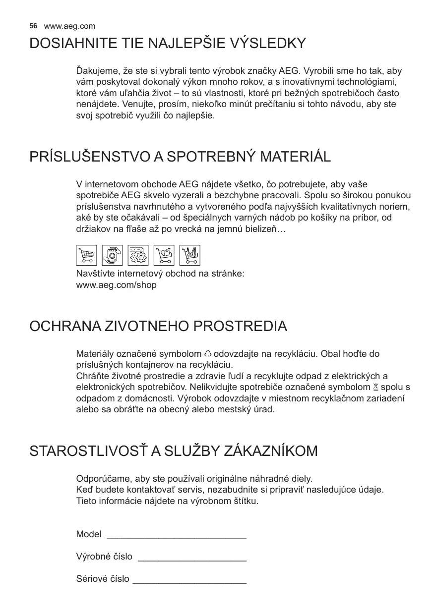 Ďakujeme, že ste si vybrali tento výrobok značky AEG. Vyrobili sme ho tak, aby vám poskytoval dokonalý výkon mnoho rokov, a s inovatívnymi technológiami, ktoré vám uľahčia život – to sú vlastnosti, ktoré pri bežných spotrebičoch často nenájdete. Venujte, prosím, niekoľko minút prečítaniu si tohto návodu, aby ste svoj spotrebič využili čo najlepšie. PRÍSLUŠENSTVO A SPOTREBNÝ MATERIÁL V internetovom obchode AEG nájdete všetko, čo potrebujete, aby vaše spotrebiče AEG skvelo vyzerali a bezchybne pracovali. Spolu so širokou ponukou príslušenstva navrhnutého a vytvoreného podľa najvyšších kvalitatívnych noriem, aké by ste očakávali – od špeciálnych varných nádob po košíky na príbor, od držiakov na fľaše až po vrecká na jemnú bielizeň… Navštívte internetový obchod na stránke: www.aeg.com/shop