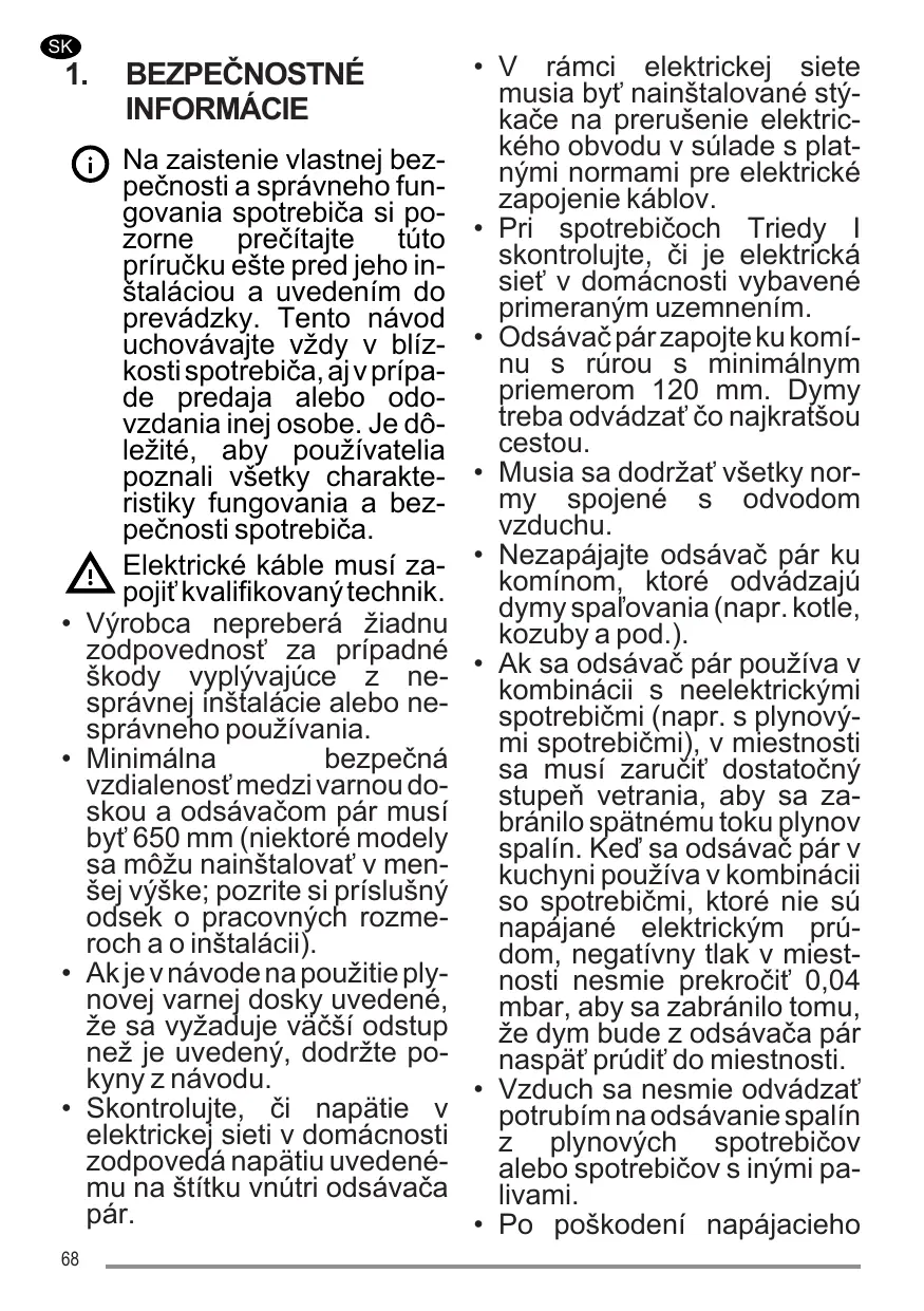 Pour les appareils de Classe I, s’assurer que l’installation électrique de votre intérieur dispose d’une mise à la terre adéquate Relier la hotte au conduit de cheminée avec un tube ayant un diamètre minimum de 120 mm. Le parcours des fumées doit être le plus court possible. Respecter toutes les normes concernant l’évacuation de l’air. Ne pas relier la hotte aspirante aux conduits de cheminée qui acheminent les fumées de combustion (par ex. de chaudières, de cheminées, etc.). Si vous utilisez l’aspirateur en même temps que des appareils non électriques (par ex. appareils à gaz), veillez à ce que la pièce soit adéquatement ventilée, afin d’empêcher le retour du flux des gaz d’évacuation. Si vous utilisez la hotte de cuisine en même temps que des appareils non alimentés à l’électricité, la pression négative dans la pièce ne doit pas dépasser 7
