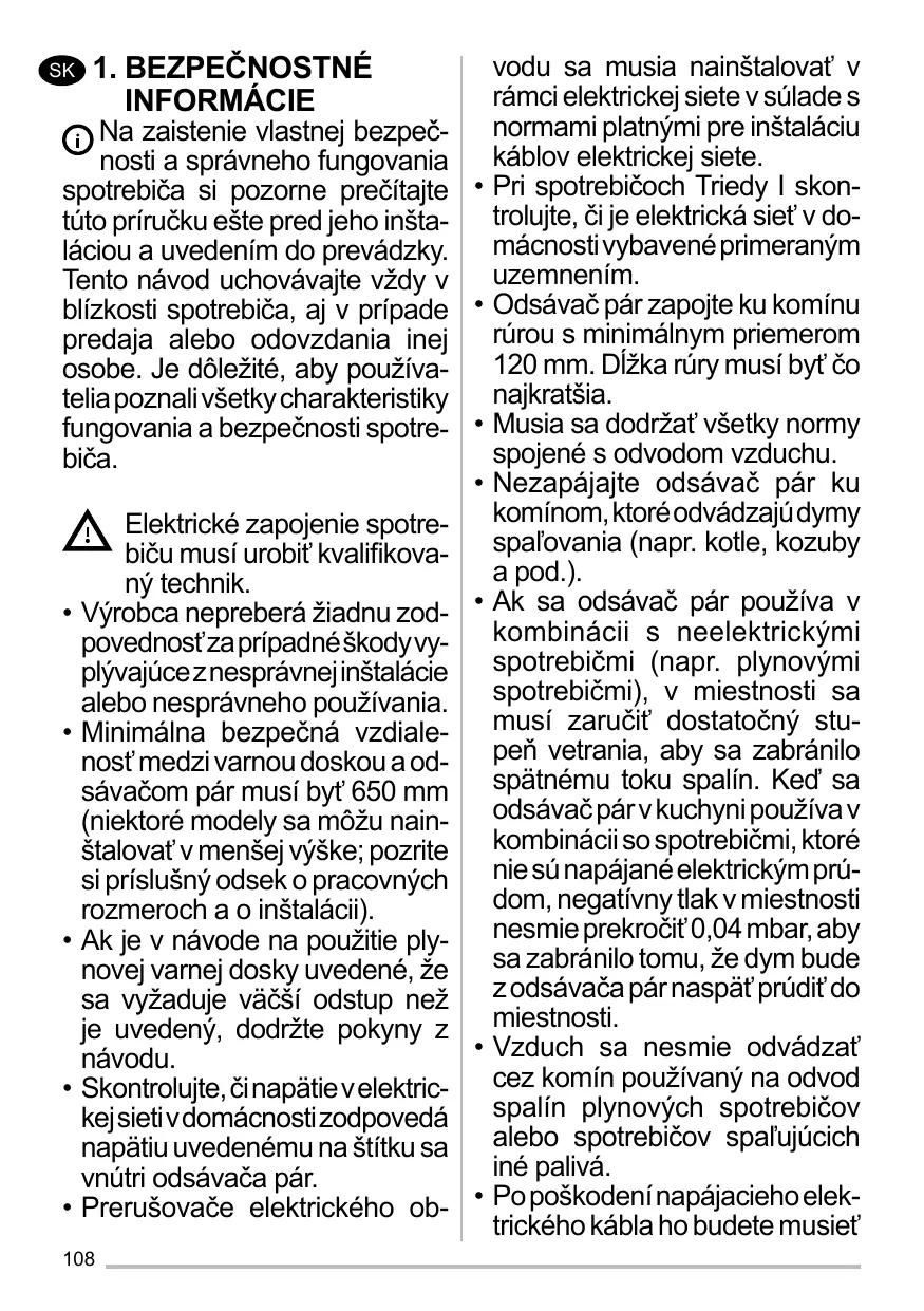 Lesdispositifsdesectionnement doivent être montés dans l’installation fixe conformément aux normes sur les systèmes de câblage. Pour les appareils de Classe I, s’assurer que l’installation électrique de votre intérieur dispose d’une mise à la terre adéquate. Reliez l’aspirateur du conduit de cheminée avec un tube ayant un diamètre minimum de 120 mm. Le parcours des fumées doit être le plus court possible. Respecter toutes les normes concernant l’évacuation de l’air. Ne reliez pas la hotte aspirante aux conduits de cheminée qui acheminent les fumées de combustion (par ex. de chaudières, de cheminées, etc.). Si vous utilisez l’aspirateur en même temps que des appareils non électriques (par ex. fonctionnant au gaz), veillez à ce que la pièce soit adéquatement ventilée, afin d’empêcher le retour du flux des gaz d’évacuation. Si vous utilisez la hotte de cuisine en même temps que des appareils non alimentés à l’électricité, la pression négative dans la pièce ne doit pas dépasser 0,04 mbar, 15