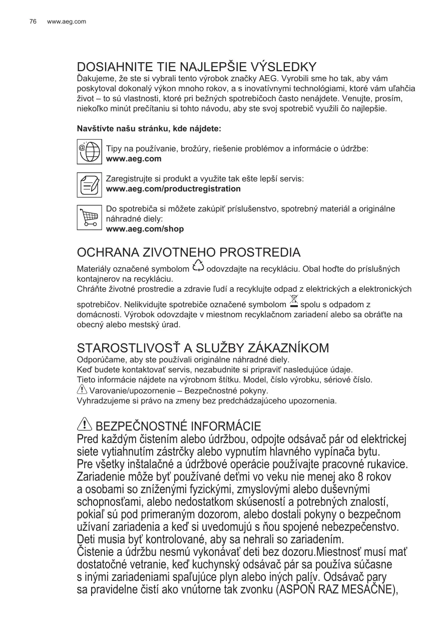 Dakujeme, ze ste si vybrali tento vyrobok značky AEG. Vyrobili sme ho tak, aby vám poskytoval dokonalý vykon mnoho rokov, a s inovatívnymi technológiami, ktoré vám ulahčiaživot – to su vlastnosti, ktoré pri bežných spotrebicoch Často nenájdete. Venujte, prosím, niekol'ko minút prečitaniu si tohto navodu, aby ste svoj spotrebic vyuzili co Najlepšie.