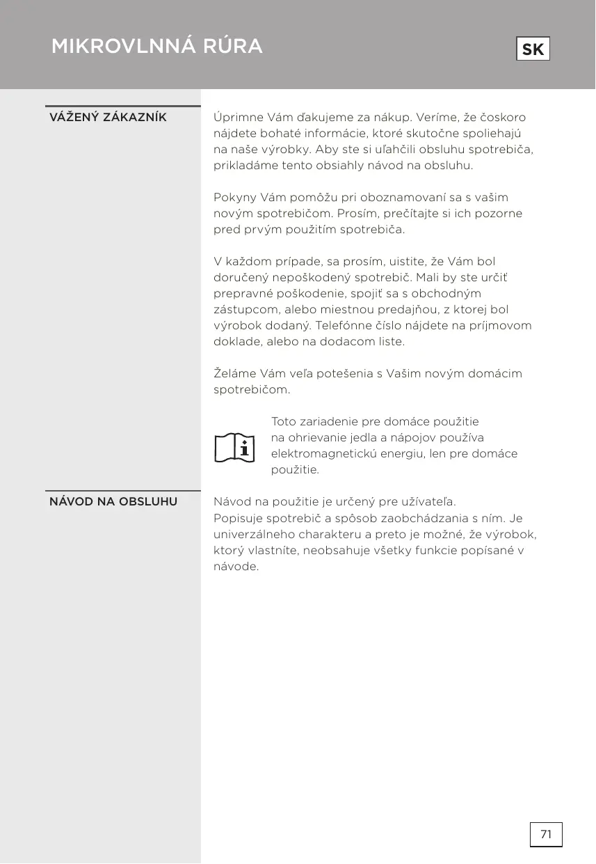 Úprimne Vám ďakujeme za nákup. Veríme, že čoskoro nájdete bohaté informácie, ktoré skutočne spoliehajú na naše výrobky. Aby ste si uľahčili obsluhu spotrebiča, prikladáme tento obsiahly návod na obsluhu. Pokyny Vám pomôžu pri oboznamovaní sa s vašim novým spotrebičom. Prosím, prečítajte si ich pozorne pred prvým použitím spotrebiča. V každom prípade, sa prosím, uistite, že Vám bol doručený nepoškodený spotrebič. Mali by ste určiť prepravné poškodenie, spojiť sa s obchodným zástupcom, alebo miestnou predajňou, z ktorej bol výrobok dodaný. Telefónne číslo nájdete na príjmovom doklade, alebo na dodacom liste. Želáme Vám veľa potešenia s Vašim novým domácim spotrebičom. Toto zariadenie pre domáce použitie na ohrievanie jedla a nápojov používa elektromagnetickú energiu, len pre domáce použitie.