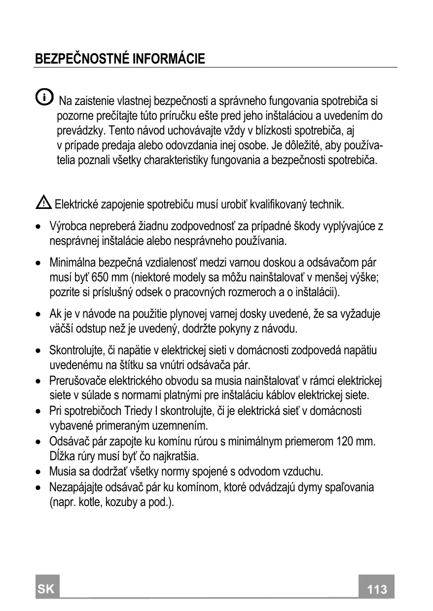 BEZPEČNOSTNÉ INFORMÁCIE Na zaistenie vlastnej bezpečnosti a správneho fungovania spotrebiča si pozorne prečítajte túto príručku ešte pred jeho inštaláciou a uvedením do prevádzky. Tento návod uchovávajte vždy v blízkosti spotrebiča, aj v prípade predaja alebo odovzdania inej osobe. Je dôležité, aby používatelia poznali všetky charakteristiky fungovania a bezpečnosti spotrebiča. Elektrické zapojenie spotrebiču musí urobiť kvalifikovaný technik. Výrobca nepreberá žiadnu zodpovednosť za prípadné škody vyplývajúce z nesprávnej inštalácie alebo nesprávneho používania. Minimálna bezpečná vzdialenosť medzi varnou doskou a odsávačom pár musí byť 650 mm (niektoré modely sa môžu nainštalovať v menšej výške; pozrite si príslušný odsek o pracovných rozmeroch a o inštalácii). Ak je v návode na použitie plynovej varnej dosky uvedené, že sa vyžaduje väčší odstup než je uvedený, dodržte pokyny z návodu. Skontrolujte, či napätie v elektrickej sieti v domácnosti zodpovedá napätiu uvedenému na štítku sa vnútri odsávača pár. Prerušovače elektrického obvodu sa musia nainštalovať v rámci elektrickej siete v súlade s normami platnými pre inštaláciu káblov elektrickej siete. Pri spotrebičoch Triedy I skontrolujte, či je elektrická sieť v domácnosti vybavené primeraným uzemnením. Odsávač pár zapojte ku komínu rúrou s minimálnym priemerom 120 mm. Dĺžka rúry musí byť čo najkratšia. Musia sa dodržať všetky normy spojené s odvodom vzduchu. Nezapájajte odsávač pár ku komínom, ktoré odvádzajú dymy spaľovania (napr. kotle, kozuby a pod.).