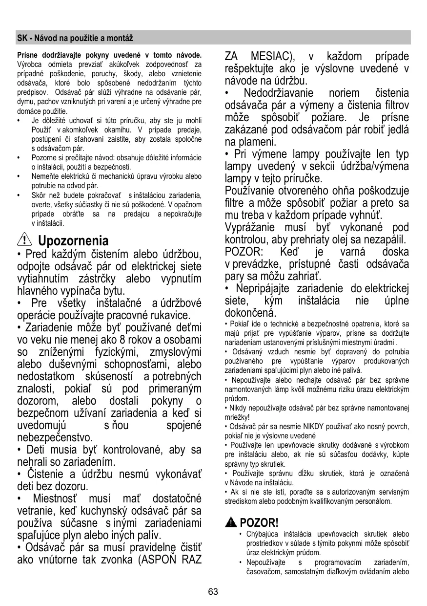 - Odsávač pár sá nesmie NIKDY použivať ako nosný povrch,Pokial nie je vyslovne uvedené