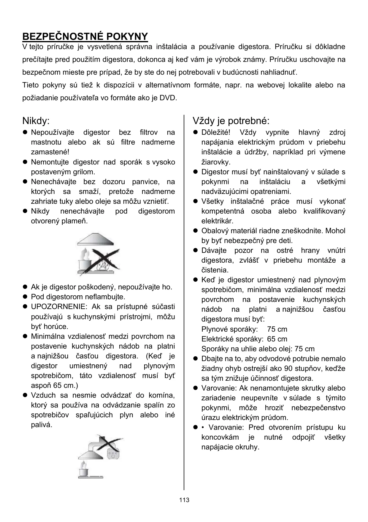 Vždy je potrebné: Vždy je potrebné: ⚫ Pri varení na plynovom sporáku hrnce a panvice vždy zakryte pokrievkami. ⚫ Keď je digestor v režime ťahu, odsáva vzduch z miestnosti. Dbajte na dodržanie príslušných opatrení na vetranie. Digestor odvádza z miestnosti zápach, ale nie paru. ⚫ Digestor je určený len na použitie v domácnosti. ⚫ Upozornenie: Spotrebič a prístupné časti sú v priebehu prevádzky spotrebiča horúce. Dávajte pozor, aby ste sa nedotkli výhrevných prvkov. Deti mladšie ako 8 rokov by sa mali zdržiavať mimo digestora, ak nie sú pod trvalým dohľadom. ⚫ Ak sa digestor používa súbežne so spotrebičmi spaľujúcimi plyn alebo iné palivá, miestnosť by sa mala primerane vetrať. ⚫ Ak sa čistenie nevykoná v súlade s pokynmi, hrozí riziko požiaru. ⚫ Musia sa dodržať predpisy týkajúce sa odvodu vzduchu. ⚫ Spotrebič treba pravidelne čistiť spôsobom uvedeným v kapitole ÚDRŽBA. ⚫ Z bezpečnostných dôvodov používajte len upevňujúce alebo montážne skrutky rovnakej veľkosti, aká sa odporúča v tejto príručke. ⚫ Pokiaľ ide o podrobné informácie týkajúce sa spôsobu a frekvencie čistenia, nahliadnite do časti návodu na použitie týkajúcej sa údržby a čistenia. ⚫ Čistenie a používateľskú údržbu by nemali vykonávať deti bez dozoru. ⚫ Ak digestor súbežne spustený so spotrebičmi napájanými inou než elektrickou energiou, podtlak v miestnosti nesmie prekročiť 4 Pa (4 x 10-5 barov). ⚫ VAROVANIE: Nebezpečenstvo požiaru: Neodkladajte predmety na varné plochy. ⚫ Nepoužívajte parný čistič. ⚫ NIKDY sa nesnažte hasiť požiar vodou, ale spotrebič vypnite a potom uduste plameň napríklad vrchnákom alebo protipožiarnou prikrývkou. ⚫ Ak je napájací kábel poškodený, musí ho vymeniť výrobca, jeho servisný zástupca alebo podobne kvalifikovaná osoba, aby sa predišlo nebezpečným situáciám. ⚫ Tento spotrebič môžu používať deti staršie ako 8 rokov a osoby s obmedzenými telesnými, zmyslovými alebo mentálnymi schopnosťami alebo nedostatočnými skúsenosťami a znalosťami, ak sú pod dohľadom alebo boli poučené o bezpečnom použití spotrebiča a chápu súvisiace nebezpečenstvá. Deti sa nesmú so spotrebičom hrať. Čistenie a používateľskú údržbu by nemali vykonávať deti bez dozoru. ⚫ Varovanie: Pred otvorením prístupu ku koncovkám je nutné odpojiť všetky napájacie okruhy.