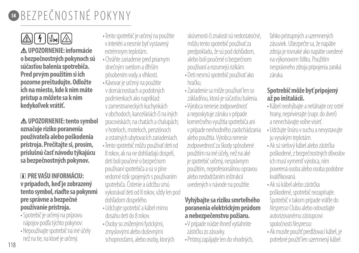 Spotrebič môže byť pripojený až po inštalácii. • Kábel neohýbajte a neťahajte cez ostré hrany, neprivierajte (napr. do dverí) a nenechávajte voľne visieť. • Udržujte šnúru v suchu a nevystavujte ju vysokým teplotám. • Ak sú sieťový kábel alebo zástrčka poškodené, z bezpečnostných dôvodov ich musí vymeniť výrobca, ním poverená osoba alebo osoba podobne kvalifikovaná. • Ak sú kábel alebo zástrčka poškodené, spotrebič nezapínajte. Vyhýbajte sa riziku smrteľného Spotrebič v takom prípade vráťte do poranenia elektrickým prúdom Nespresso Clubu alebo odovzdajte a nebezpečenstvu požiaru. autorizovanému zástupcovi • V prípade núdze ihneď vytiahnite spoločnosti Nespresso. zástrčku zo zásuvky. • Ak musíte použiť predlžovací kábel, je • Prístroj zapájajte len do vhodných, potrebné použiť len uzemnený kábel