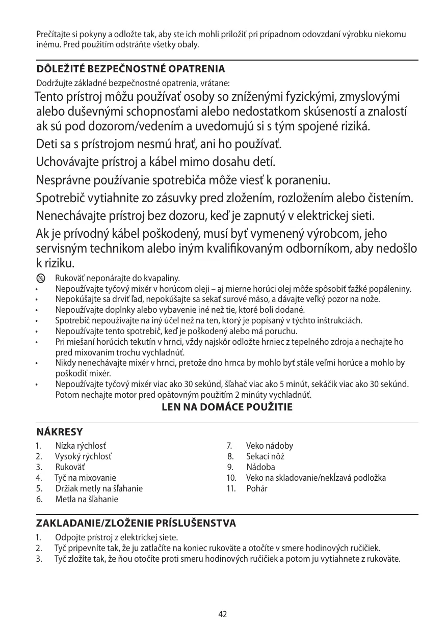 Les enfants ne doivent pas utiliser ni jouer avec l'appareil. Tenez l'appareil et le câble hors de portée des enfants. Une utilisation inappropriée de l'appareil peut causer des blessures. Débranchez l'appareil avant le montage, le démontage ou le nettoyage. Ne laissez pas l’appareil sans surveillance lorsqu’il est branché. Si le câble est abîmé, vous devez le faire remplacer par le fabricant, un de ses techniciens agréés ou une personne également qualifiée, pour éviter tout danger. H • • N’essayez pas de piler de la glace ou de hacher de la viande crue et faites attention aux lames. N’adaptez pas d’accessoires autres que ceux fournis. N’utilisez pas l’appareil dans un autre but que celui décrit dans ces instructions. N’utilisez pas l’appareil s’il est endommagé ou s’il ne fonctionne pas correctement. Si vous mélangez des liquides chauds dans une casserole, retirez dans tous les cas la casserole de la source de chaleur et laissez-la refroidir un peu avant de procéder au mélange. Ne laissez en aucun cas le mélangeur dans la casserole, car le fond de cette dernière pourrait être encore très chaud et endommager le mélangeur. Ne pas utiliser le batteur pendant plus de 30 secondes, le fouet pendant plus de 5 minutes, le hachoir pendant plus de 30 secondes. Laissez le moteur refroidir pendant 2 minutes avant d’utiliser à nouveau ces accessoires.