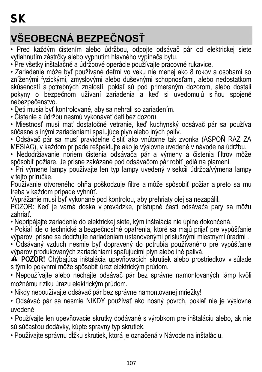 • Les enfants ne doivent pas jouer avec l’appareil. • Le nettoyage et l’entretien par l’usager ne doivent pas être effectués par des enfants sans surveillance. • La pièce doit avoir une aération suffisante lorsque la hotte est utilisée conjointement avec d'autres appareils fonctionnant au gaz ou autres combustibles. • La hotte doit être régulièrement nettoyée à la fois à l'intérieur et à l'extérieur (AU MOINS UNE FOIS PAR MOIS); cela devrait se faire en conformité avec les instructions d'entretien. Le non respect des instructions expressément fournies concernant le nettoyage de la hotte et des filtres peut provoquer des risques d'incendie. • Ne pas flamber d’aliments sous la hotte. • Pour le remplacement de la lampe, utilisez uniquement le type de lampe spécifié dans la section remplacement/maintenance lampe dans ce manuel. L'utilisation d'une flamme nue est dommageable pour les filtres et peut causer un incendie, par conséquent, il est déconseillé de l'utiliser. La friture doit être faite avec soin afin de s’assurer que l’huile surchauffée ne prenne pas feu. AVERTISSEMENT: Lorsque la table de cuisson est en fonctionnement, les parties accessibles de la hotte peuvent devenir très chaudes. • Ne pas brancher l'appareil au réseau électrique avant que l'installation ne soit complètement terminée. • En ce qui concerne les mesures techniques et de sécurité à prendre pour l'évacuation des fumées, respectez strictement les dispositions des règlements locales. • L’air ne doit pas être envoyé dans un conduit utilisé pour évacuer les fumées d’appareils utilisant du gaz ou un autre combustible. ATTENTION ! Le défaut d'installer les vis et les dispositifs de fixation conformément à ces instructions peut entraîner des risques électriques. • Ne pas utiliser ou laisser la hotte sans les lampes correctement montées, car un éventuel risque de choc électrique est possible. • N’utilisez jamais la hotte sans la grille montée correctement! • La hotte ne doit JAMAIS être utilisée comme une surface d'appui, sauf indication expresse. 19