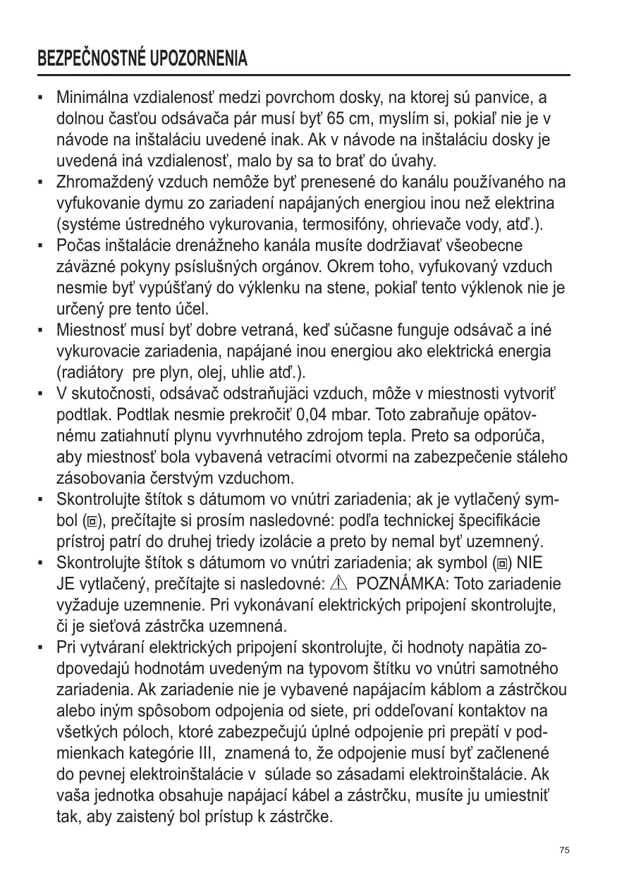 ▪ L’air aspiré ne doit pas être canalisé dans un conduit qui est utilisé pour évacuer les fumées produites par des appareils alimentés par des sources d’énergies autres que l’énergie électrique (installations de chauffage central, radiateurs, chauffe-eau, etc.). ▪ Pour évacuer l’air qui doit être éliminé respectez les prescriptions des autorités compétentes. De plus l’air qui doit être évacué ne doit pas être déchargé dans une cavité du mur, à moins que cette cavité soit prévue pour ce but. ▪ Prévoyez une aération de la pièce adéquate quand une hotte et des appareils alimentés par une énergie autre que l’énergie électrique (poêle à gaz, à huile, à charbon etc.) sont utilisés en même temps. En effet, en évacuant l’air, la hotte pourrait créer une dépression dans la pièce. La pression négative de la pièce ne doit pas dépasser 0,04mbar, évitant ainsi que la source de chaleur provoque un appel des gaz qui doivent être évacués. Il est donc nécessaire d’équiper la pièce de prises d’air alimentant un flux d’air frais constant. ▪ Contrôler la plaque des caractéristiques techniques se trouvant à l’intérieur de l’appareil; si le symbole ( ) figure sur la plaque suivre les instructions suivantes: cet appareil est construit pour appartenir à la classe d’isolation II ; il ne doit donc pas être relié à la terre. ▪ Contrôler la plaque des caractéristiques techniques se trouvant à l’intérieur de l’appareil; si le symbole ( ) NE figure pas sur la plaque suivre les instructions suivantes: ATTENTION: cet appareil doit être relié à la terre. Lors du raccordement électrique s’assurer que la prise de courant est équipée d’une connexion de mise à la terre. ▪ Lors du raccordement électrique assurez-vous que les valeurs de tension correspondent à celles qui sont indiquées sur la plaque des caractéristiques de l’appareil, qui se trouve à l’intérieur de celui-ci. Si votre appareil, n’a pas de câble flexible qui ne peut pas être séparé ni de prise, ou bien d’autre dispositif qui garantisse le débranchement de tous les 10