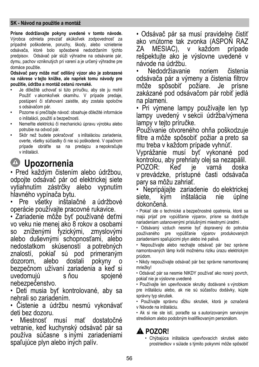 • Odsávač pár sa musí pravidelne čistiť ako vnútorne tak zvonka (ASPOŇ RAZ ZA MESIAC), v každom prípade rešpektujte ako je výslovne uvedené v návode na údržbu. • Nedodržiavanie noriem čistenia odsávača pár a výmeny a čistenia filtrov môže spôsobiť požiare. Je prísne zakázané pod odsávačom pár robiť jedlá na plameni. • Pri výmene lampy používajte len typ lampy uvedený v sekcii údržba/výmena lampy v tejto príručke. Používanie otvoreného ohňa poškodzuje filtre a môže spôsobiť požiar a preto sa mu treba v každom prípade vyhnúť. Vyprážanie musí byť vykonané pod kontrolou, aby prehriaty olej sa nezapálil. POZOR: Keď je varná doska v prevádzke, prístupné časti odsávača pary sa môžu zahriať. • Nepripájajte zariadenie do elektrickej siete, kým inštalácia nie úplne dokončená.
