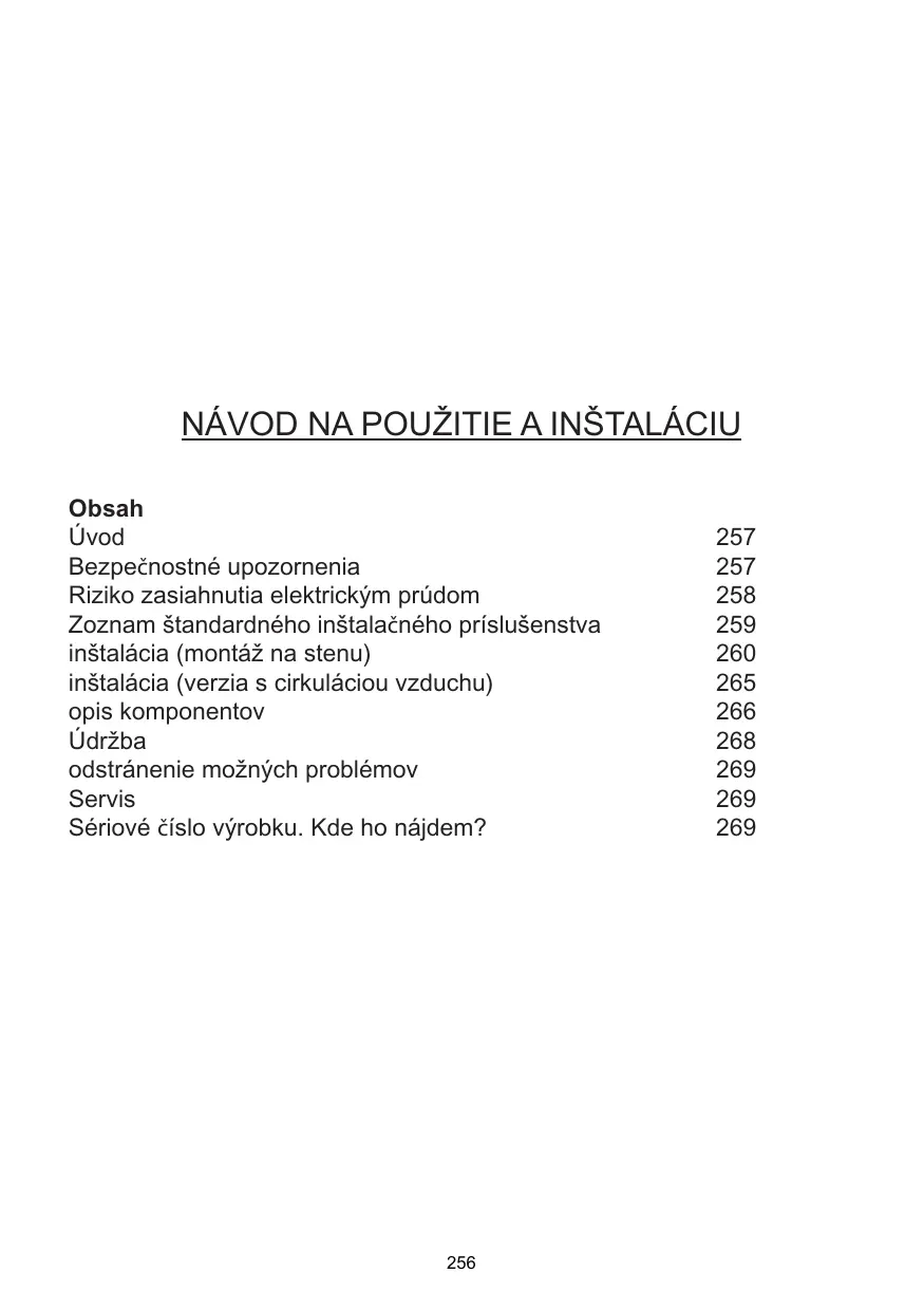 Návod na použitie a inštaláciu Obsah Úvod Bezpečnostné upozornenia Riziko zasiahnutia elektrickým prúdom Zoznam štandardného inštalačného príslušenstva inštalácia (montáž na stenu) inštalácia (verzia s cirkuláciou vzduchu) opis komponentov Údržba odstránenie možných problémov Servis Sériové číslo výrobku. Kde ho nájdem?