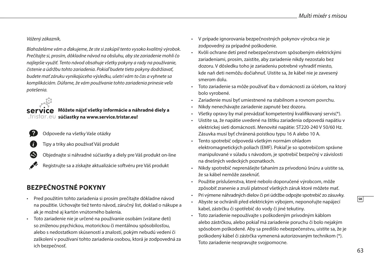 Môžete nájsť všetky informácie a náhradné diely a súčiastky na www.service.tristar.eu!