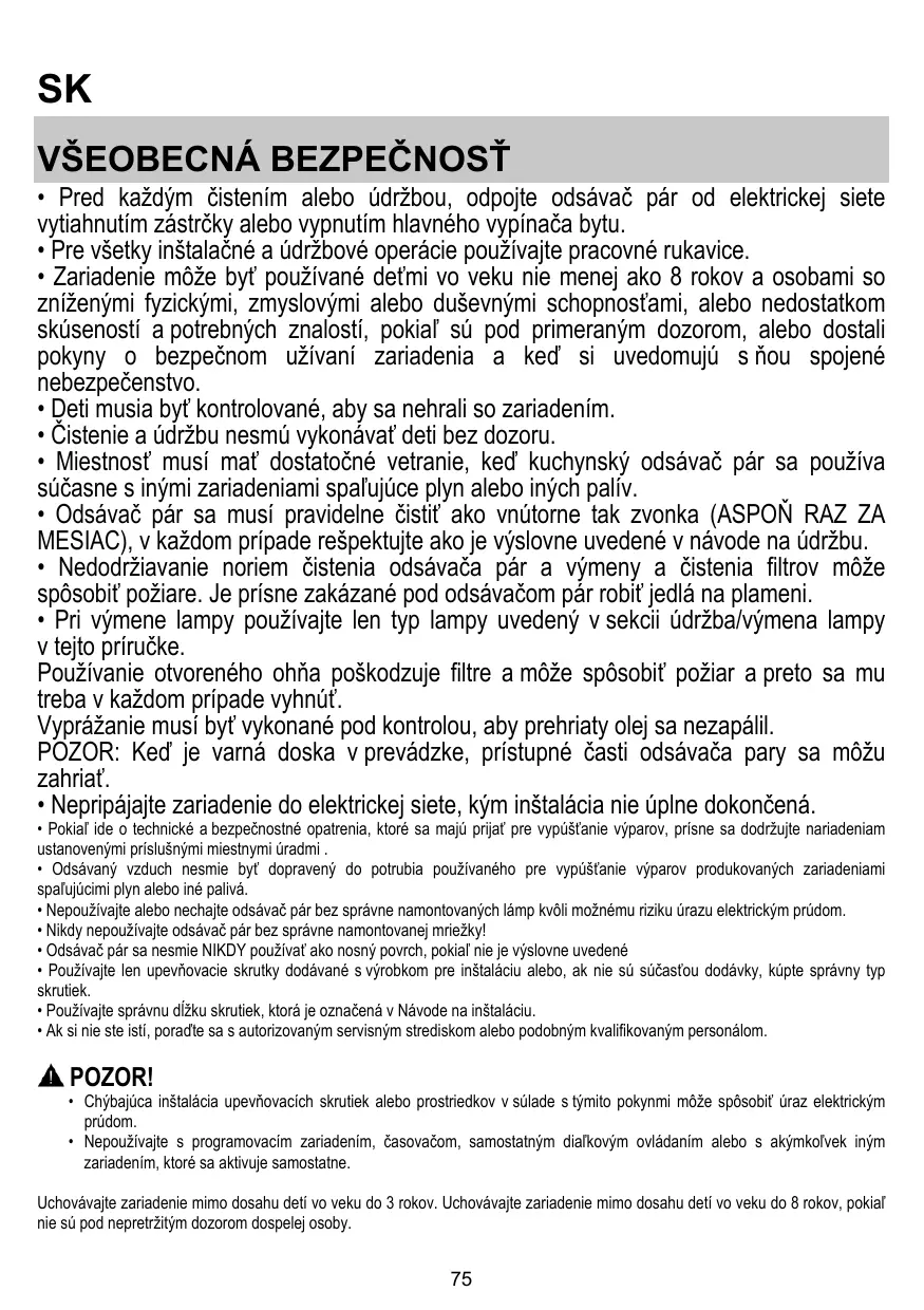 • Les enfants ne doivent pas jouer avec l’appareil. • Le nettoyage et l’entretien par l’usager ne doivent pas être effectués par des enfants sans surveillance. • La pièce doit avoir une aération suffisante lorsque la hotte est utilisée conjointement avec d'autres appareils fonctionnant au gaz ou autres combustibles. • La hotte doit être régulièrement nettoyée à la fois à l'intérieur et à l'extérieur (AU MOINS UNE FOIS PAR MOIS); cela devrait se faire en conformité avec les instructions d'entretien. Le non respect des instructions expressément fournies concernant le nettoyage de la hotte et des filtres peut provoquer des risques d'incendie. • Ne pas flamber d’aliments sous la hotte. • Pour le remplacement de la lampe, utilisez uniquement le type de lampe spécifié dans la section remplacement/maintenance lampe dans ce manuel. L'utilisation d'une flamme nue est dommageable pour les filtres et peut causer un incendie, par conséquent, il est déconseillé de l'utiliser. La friture doit être faite avec soin afin de s’assurer que l’huile surchauffée ne prenne pas feu. AVERTISSEMENT: Lorsque la table de cuisson est en fonctionnement, les parties accessibles de la hotte peuvent devenir très chaudes. • Ne pas brancher l'appareil au réseau électrique avant que l'installation ne soit complètement terminée.