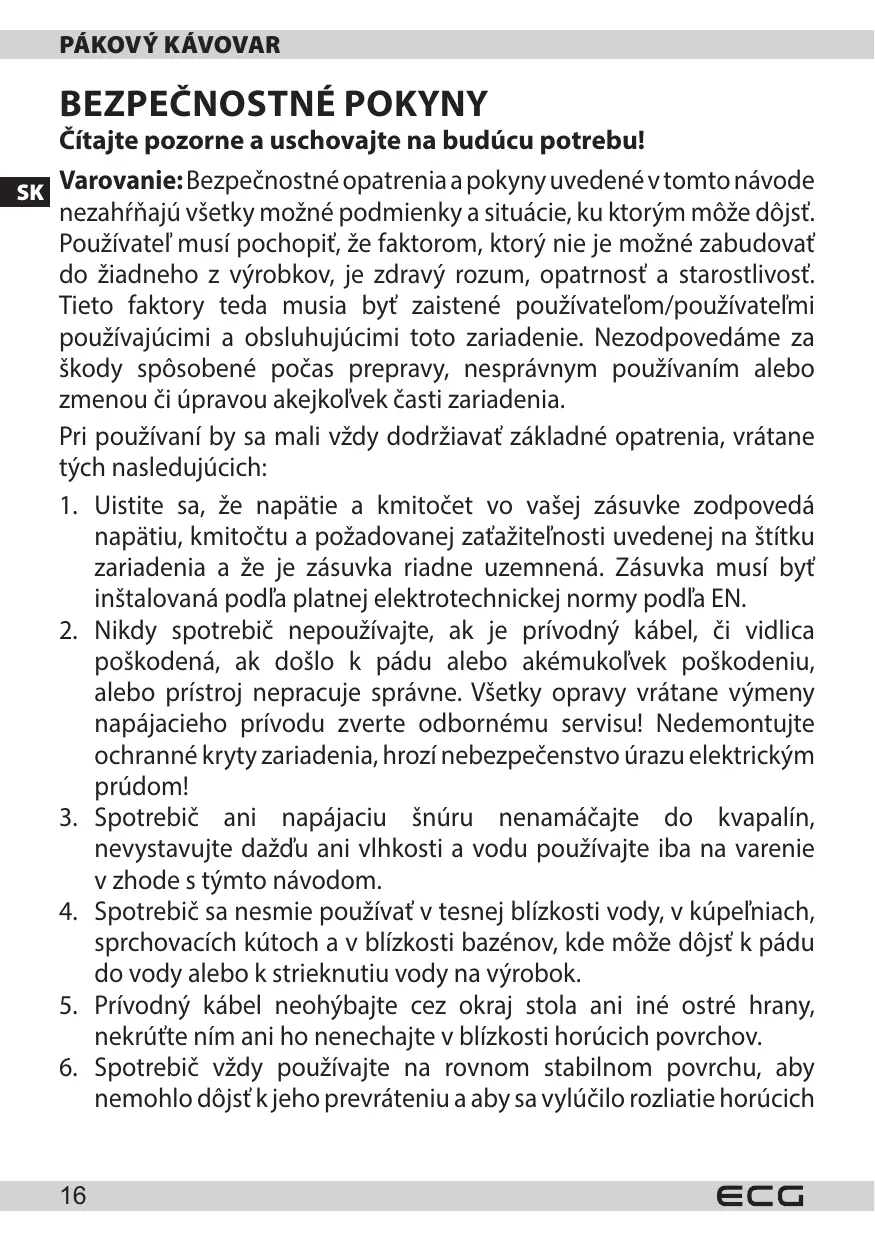 - ECG nenesie zodpovednost' za škody alebo zranenia spôsobené nedbalostou alebo nesprávnym používaním. Pred použitím si nezabudnite pozorne prečitať všetky instrukcie a informácie. Vonkajši povrch tohto prístroja sa zahrieva a može spôsobit popálenie. Nenechávajte bez dozoru v prítomnosti detí.