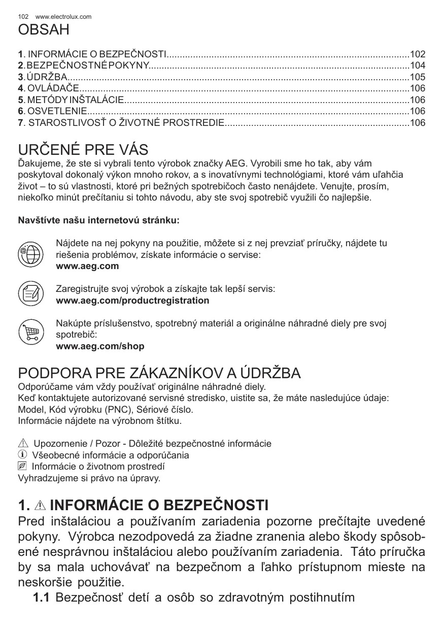 Ďakujeme, že ste si vybrali tento výrobok značky AEG. Vyrobili sme ho tak, aby vám poskytoval dokonalý výkon mnoho rokov, a s inovatívnymi technológiami, ktoré vám uľahčia život – to sú vlastnosti, ktoré pri bežných spotrebičoch často nenájdete. Venujte, prosím, niekoľko minút prečítaniu si tohto návodu, aby ste svoj spotrebič využili čo najlepšie. Navštívte našu internetovú stránku: Nájdete na nej pokyny na použitie, môžete si z nej prevziať príručky, nájdete tu riešenia problémov, získate informácie o servise: www.aeg.com Zaregistrujte svoj výrobok a získajte tak lepší servis: www.aeg.com/productregistration Nakúpte príslušenstvo, spotrebný materiál a originálne náhradné diely pre svoj spotrebič: www.aeg.com/shop