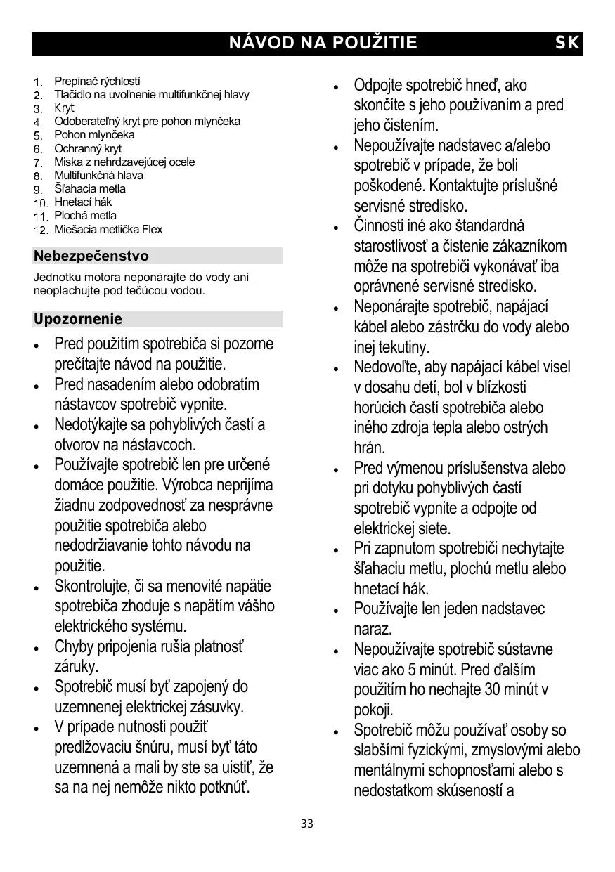 Obturateur amovible pour la prise de courant du hachoir Bouton de déverrouillage du couteau Prise de courant pour le hachoir Couvercle du bol Bol en acier inoxydable Tête multifonction Fouet Crochet pétrisseur éléments mobiles et des orifices destinés à l'insertion des accessoires. Utilisez l'appareil uniquement pour l'usage ménager auquel il est destiné. Le fabricant déclinera toute responsabilité si l'appareil fait l'objet d'une utilisation inappropriée ou si les présentes instructions ne sont pas respectées. Vérifiez que la tension nominale de votre appareil correspond bien à celle de votre réseau électrique. Toute erreur de raccordement annulera la garantie. L'appareil doit être branché à une prise raccordée à la terre.