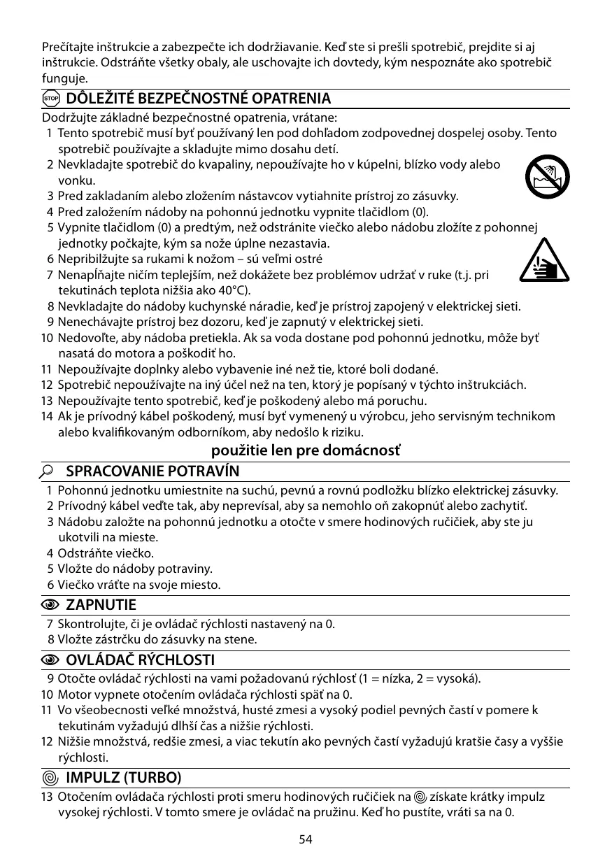 2 N’immergez pas l’appareil dans un liquide, ne l’utilisez pas dans une salle de bains, à proximité d’une source d’eau ou à l’extérieur. 3 Débranchez l’appareil avant d’adapter ou de retirer les accessoires. 4 Eteignez (0) avant de mettre le bol en place sur le bloc moteur. 5 Eteignez (0) et attendez jusqu’à ce que les lames s’arrêtent avant d’enlever le couvercle du bol ou avant d’enlever le bol du bloc moteur. 6 Tenez vos mains à l’écart des lames – elles sont tranchantes 7 Ne remplissez pas avec quelque chose de trop chaud qui n’est plus agréable au toucher pour vous (par ex. températures des liquides inférieures à 40°C). 8 Ne placez aucun ustensile dans le bol lorsque l’appareil est branché. 9 Ne laissez pas l’appareil sans surveillance lorsqu’il est branché. 10 Veillez à ce que le bol ne déborde pas. Tout liquide qui se met sous le bloc moteur pourrait être absorbé par le moteur et risquerait de l’endommager. 11 N’installez que des accessoires et des pièces de rechange qui proviennent du fabricant. 12 N’utilisez pas l’appareil dans un autre but que celui décrit dans ces instructions. 13 N’utilisez pas l’appareil s’il est endommagé ou ne fonctionne pas correctement. 14 Si le câble est abîmé, vous devez le faire remplacer par le fabricant, un de ses techniciens agréés ou une personne également qualifiée, pour éviter tout danger.