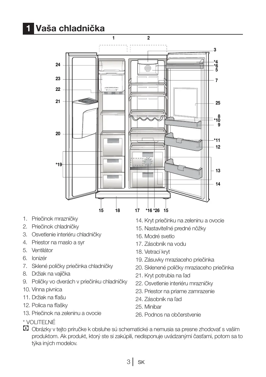 Nastavenie teploty v priestore chladničky 21 Nastavenie teploty v mraziacom priečinku 21 Funkcia priame zamrazenie 21 Funkcia rýchleho chladenia 21 Tlačidlo Dovolenka 22 Tlačidlo „Auto Eco“ (Automatické šetrenie) (špeciálna úsporná funkcia) 22 Ionizátor 22 Tlačidlo „Key Lock“ (Uzamknutie tlačidiel) 22 Osvetlenie dávkovača vody 22 Výber typu vody/ľadu 22 Dávkovač ľadu/vody 22 Používanie dávkovača ľadu 22 „Ice Off“ (Vypnutý ľad) 23 Používanie vodného zdroja 24 Zberná nádoba 24 Zasúvacie police telesa 24 Modré svetlo 25 Ion: . 25 Držiak na vajíčka 25 Priestor na priame zamrazenie 25 Posuvníky ovládania vlhkosti v priečinku na zeleninu a ovocie 25 Odporúčania pre uchovávanie mrazeného jedla 26 Rozmrazovanie 26 Výmena žiarovky vnútorného osvetlenia.26