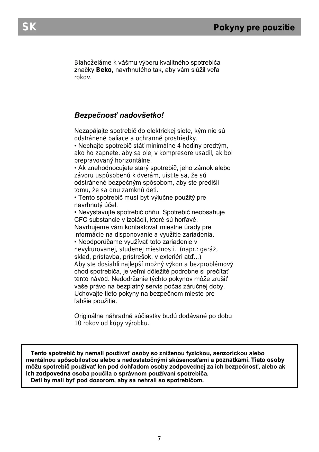 Bezpečnosť nadovšetko! Nezapájajte spotrebič do elektrickej siete, kým nie sú odstránené baliace a ochranné prostriedky. • Nechajte spotrebič stáť minimálne 4 hodiny predtým, ako ho zapnete, aby sa olej v kompresore usadil, ak bol prepravovaný horizontálne. • Ak znehodnocujete starý spotrebič, jeho zámok alebo závoru uspôsobenú k dverám, uistite sa, že sú odstránené bezpečným spôsobom, aby ste predišli tomu, že sa dnu zamknú deti. • Tento spotrebič musí byť výlučne použitý pre navrhnutý účel. • Nevystavujte spotrebič ohňu. Spotrebič neobsahuje CFC substancie v izolácií, ktoré sú horľavé. Navrhujeme vám kontaktovať miestne úrady pre informácie na disponovanie a využitie zariadenia. • Neodporúčame využívať toto zariadenie v nevykurovanej, studenej miestnosti. (napr.: garáž, sklad, prístavba, prístrešok, v exteriéri atď...) Aby ste dosiahli najlepší možný výkon a bezproblémový chod spotrebiča, je veľmi dôležité podrobne si prečítať tento návod. Nedodržanie týchto pokynov môže zrušiť vaše právo na bezplatný servis počas záručnej doby. Uchovajte tieto pokyny na bezpečnom mieste pre ľahšie použitie. Originálne náhradné súčiastky budú dodávané po dobu 10 rokov od kúpy výrobku.