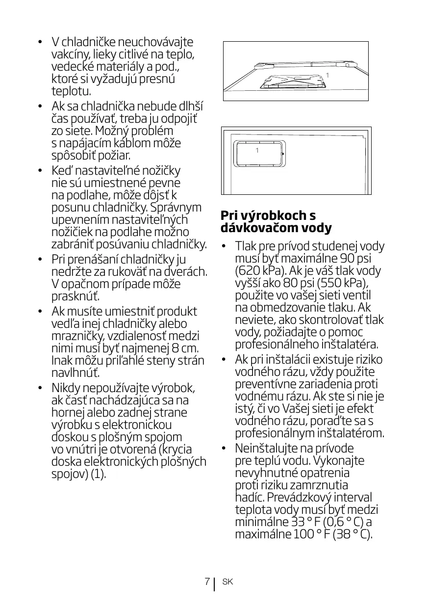 Overlaad de koelkast niet zodat luchtcirculatie aan de binnenzijde niet geblokkeerd wordt. Plaats de koelkast niet in direct zonlicht of naast warmteafgevende apparaten zoals een oven, vaatwasser minstens 30 cm verwijderd van warmteafgevende bronnen en minstens 5 cm van elektrische ovens. Bewaar uw levensmiddelen in gesloten bakjes. fontanero profesional si no está seguro de que no hay un efecto del golpe de ariete en la instalación. No instale en la entrada de agua caliente. Tome precauciones contra del riesgo de congelación en las mangueras. El intervalo de funcionamiento de la temperatura del agua debe ser un mínimo de 33°F