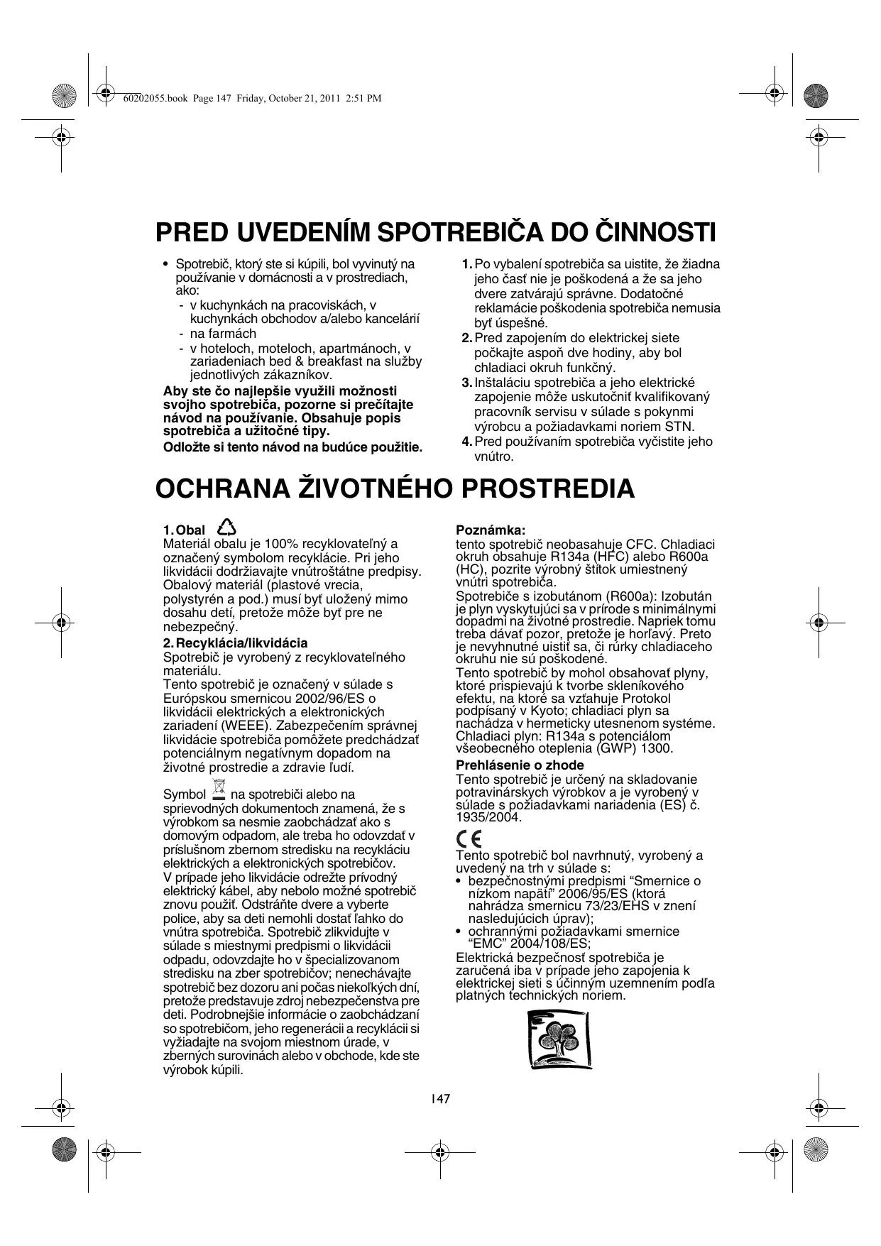 Spotrebič je vyrobený z recyklovateľného materiálu. Tento spotrebič je označený v súlade s Európskou smernicou 2002/96/ES o likvidácii elektrických a elektronických zariadení (WEEE). Zabezpečením správnej likvidácie spotrebiča pomôžete predchádzať potenciálnym negatívnym dopadom na životné prostredie a zdravie ľudí. Poznámka: tento spotrebič neobasahuje CFC. Chladiaci okruh obsahuje R134a (HFC) alebo R600a (HC), pozrite výrobný štítok umiestnený vnútri spotrebiča. Spotrebiče s izobutánom (R600a): Izobután je plyn vyskytujúci sa v prírode s minimálnymi dopadmi na životné prostredie. Napriek tomu treba dávať pozor, pretože je horľavý. Preto je nevyhnutné uistiť sa, či rúrky chladiaceho okruhu nie sú poškodené. Tento spotrebič by mohol obsahovať plyny, ktoré prispievajú k tvorbe skleníkového efektu, na ktoré sa vzťahuje Protokol podpísaný v Kyoto; chladiaci plyn sa nachádza v hermeticky utesnenom systéme. Chladiaci plyn: R134a s potenciálom všeobecného oteplenia (GWP) 1300. Prehlásenie o zhode Tento spotrebič je určený na skladovanie potravinárskych výrobkov a je vyrobený v súlade s požiadavkami nariadenia (ES) č. 1935/2004. Symbol na spotrebiči alebo na sprievodných dokumentoch znamená, že s výrobkom sa nesmie zaobchádzať ako s domovým odpadom, ale treba ho odovzdať v príslušnom zbernom stredisku na recykláciu elektrických a elektronických spotrebičov. V prípade jeho likvidácie odrežte prívodný elektrický kábel, aby nebolo možné spotrebič znovu použiť. Odstráňte dvere a vyberte police, aby sa deti nemohli dostať ľahko do vnútra spotrebiča. Spotrebič zlikvidujte v súlade s miestnymi predpismi o likvidácii odpadu, odovzdajte ho v špecializovanom stredisku na zber spotrebičov; nenechávajte spotrebič bez dozoru ani počas niekoľkých dní, pretože predstavuje zdroj nebezpečenstva pre deti. Podrobnejšie informácie o zaobchádzaní so spotrebičom, jeho regenerácii a recyklácii si vyžiadajte na svojom miestnom úrade, v zberných surovinách alebo v obchode, kde ste výrobok kúpili. Tento spotrebič bol navrhnutý, vyrobený a uvedený na trh v súlade s: