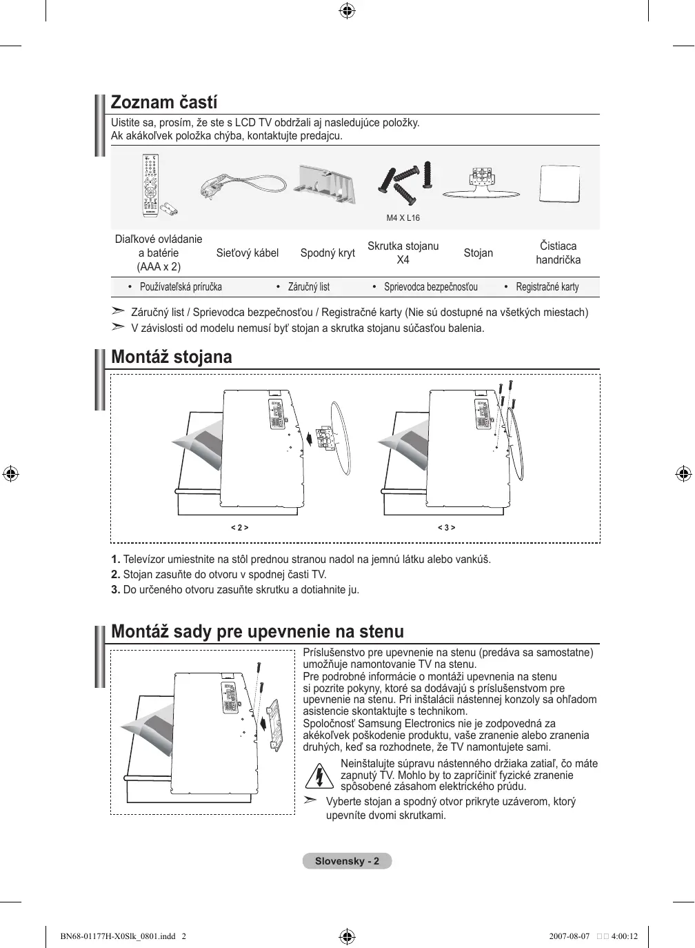 - Registračné karty Záručný list / Sprievodca bezpečnosťou / Registračné karty (Nie sú dostupné na všetkých miestach) V závislosti od modelu nemusí byť stojan a skrutka stojanu súčasťou balenia. Montáž stojana <2> <3> . Televízor umiestnite na stôl prednou stranou nadol na jemnú látku alebo vankúš. . Stojan zasuňte do otvoru v spodnej časti TV.