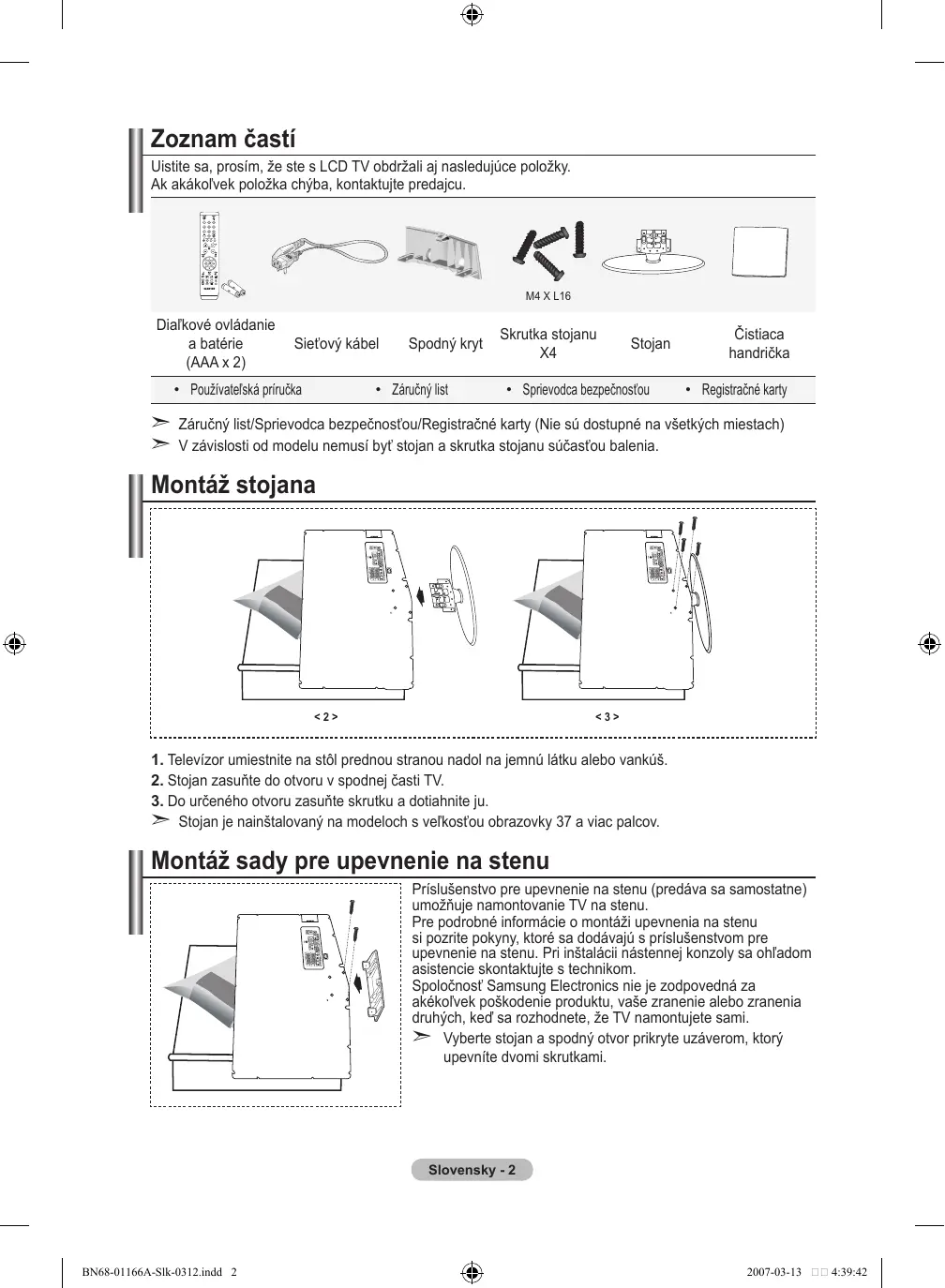- Registračné karty Záručný list/Sprievodca bezpečnosťou/Registračné karty (Nie sú dostupné na všetkých miestach) V závislosti od modelu nemusí byť stojan a skrutka stojanu súčasťou balenia. Montáž stojana <2> <3> . Televízor umiestnite na stôl prednou stranou nadol na jemnú látku alebo vankúš. . Stojan zasuňte do otvoru v spodnej časti TV.