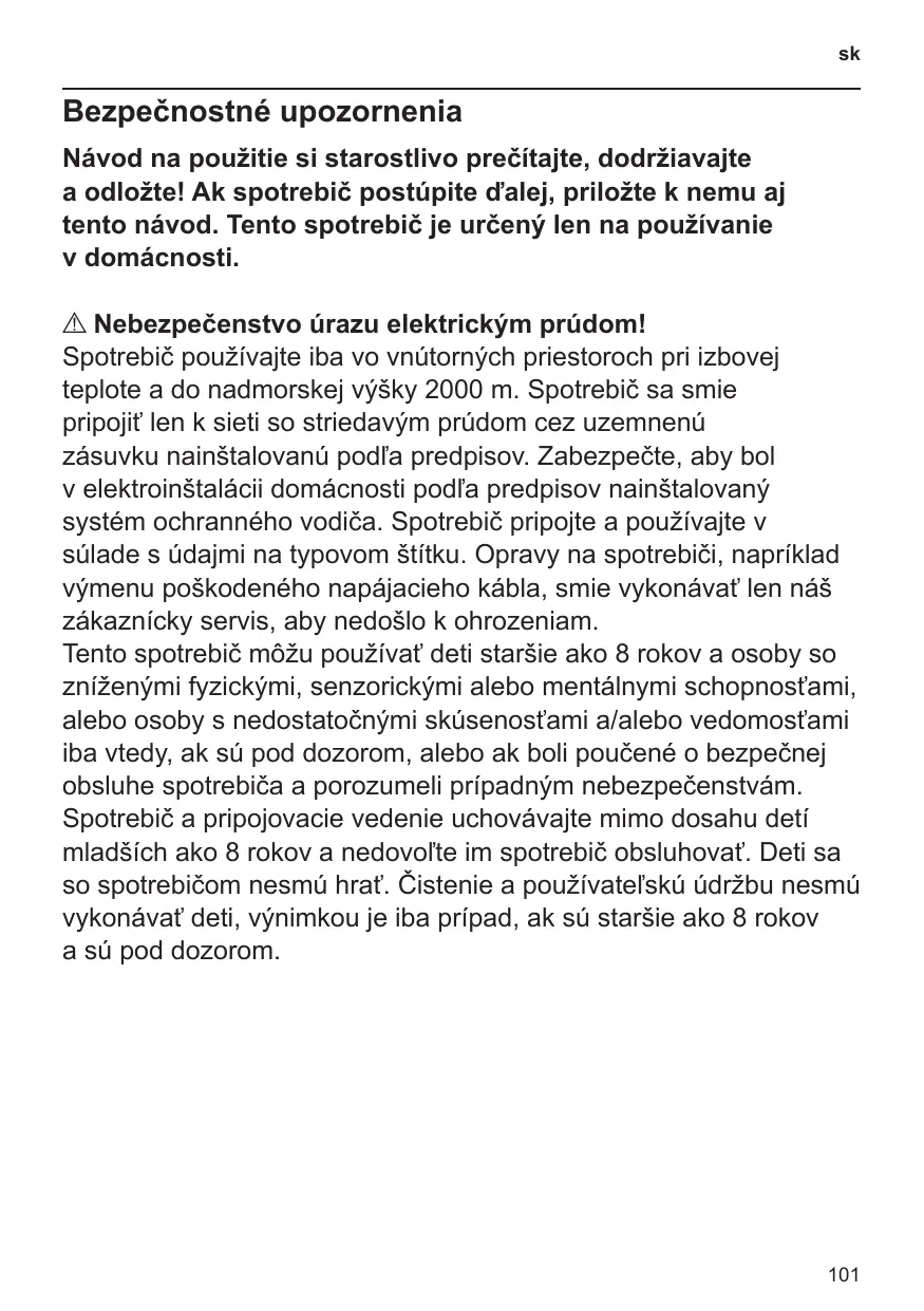 Bezpečnostné upozornenia Návod na použitie si starostlivo prečítajte, dodržiavajte a odložte! Ak spotrebič postúpite ďalej, priložte k nemu aj tento návod. Tento spotrebič je určený len na používanie v domácnosti. A Nebezpečenstvo úrazu elektrickým prúdom! Spotrebič používajte iba vo vnútorných priestoroch pri izbovej teplote a do nadmorskej výšky 2000 m. Spotrebič sa smie pripojiť len k sieti so striedavým prúdom cez uzemnenú zásuvku nainštalovanú podľa predpisov. Zabezpečte, aby bol v elektroinštalácii domácnosti podľa predpisov nainštalovaný systém ochranného vodiča. Spotrebič pripojte a používajte v súlade s údajmi na typovom štítku. Opravy na spotrebiči, napríklad výmenu poškodeného napájacieho kábla, smie vykonávať len náš zákaznícky servis, aby nedošlo k ohrozeniam. Tento spotrebič môžu používať deti staršie ako 8 rokov a osoby so zníženými fyzickými, senzorickými alebo mentálnymi schopnosťami, alebo osoby s nedostatočnými skúsenosťami a/alebo vedomosťami iba vtedy, ak sú pod dozorom, alebo ak boli poučené o bezpečnej obsluhe spotrebiča a porozumeli prípadným nebezpečenstvám. Spotrebič a pripojovacie vedenie uchovávajte mimo dosahu detí mladších ako 8 rokov a nedovoľte im spotrebič obsluhovať. Deti sa so spotrebičom nesmú hrať. Čistenie a používateľskú údržbu nesmú vykonávať deti, výnimkou je iba prípad, ak sú staršie ako 8 rokov a sú pod dozorom.