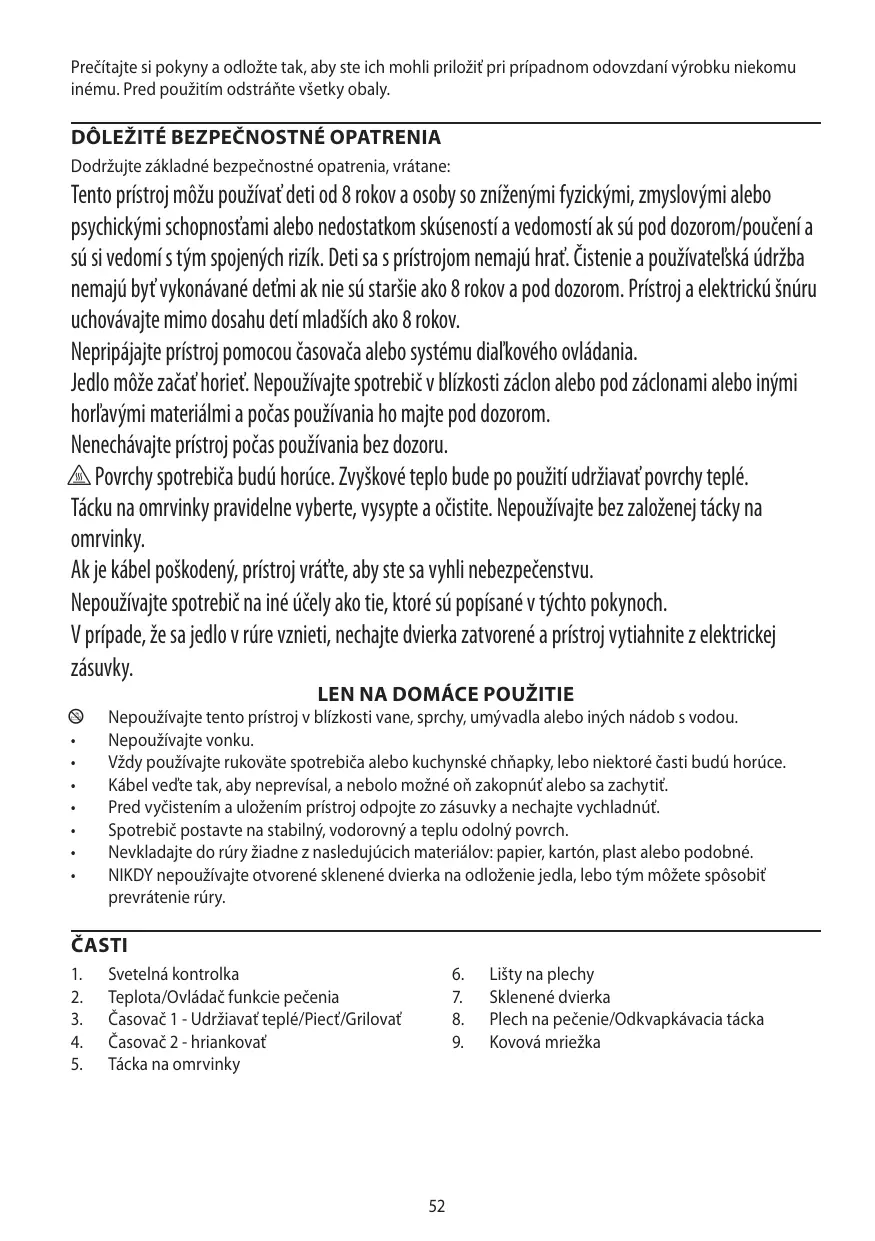 Cet appareil peut être utilisé par des enfants âgés de 8 ans et plus et par des personnes aux aptitudes physiques, sensorielles ou mentales réduites ou ne possédant pas l’expérience et les connaissances suffisantes, pour autant que ces personnes soient supervisées/aient reçu des instructions et soient conscientes des risques encourus. Les enfants ne peuvent pas jouer avec l’appareil. Le nettoyage et l’entretien par l’utilisateur ne doivent pas être effectués par des enfants, à moins qu’ils ne soient âgés de plus de 8 ans et qu’ils soient supervisés. Tenez l’appareil et le câble hors de portée des enfants de moins de 8 ans. Veillez à ne pas connecter l’appareil via une minuterie ou un système de télécommande. Les aliments peuvent brûler. N’utilisez pas l’appareil à côté ou au-dessous de rideaux ou d’autres matériaux combustibles et surveillez-le pendant son utilisation. Ne laissez pas l’appareil sans surveillance en cours d’utilisation. ¬ Les surfaces de l’appareil vont s’échauffer. La chaleur résiduelle permet de maintenir les surfaces chaudes après utilisation. Retirez, videz et nettoyez régulièrement le bac à miettes. N’utilisez pas l’appareil sans le bac à miettes. Si le câble est endommagé, retournez l’appareil afin d’éviter tout risque. N’utilisez pas l’appareil à d’autres fins que celles décrites dans ce mode d’emploi. En cas de flambée des aliments, maintenez la porte fermée et débranchez l’appareil. USAGE MÉNAGER UNIQUEMENT