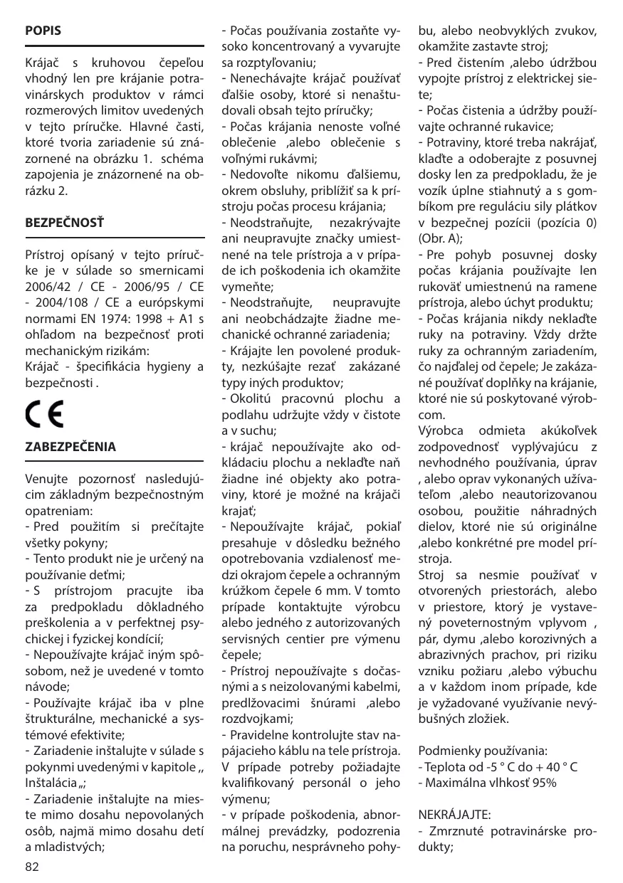 Mode d’emploi: - Température de -5 °C à +40 °C - Humidité max 95% PRODUITS QUI NE PEUVENT PAS ÊTRE DÉCOUPÉS: -- produits alimentaires congelés; -- produits alimentaires surgelés; -- produits alimentaires avec os (viandes et poissons); -- tout autre produit non destiné à une utilisation alimentaire. AVERTISSEMENT! Le moteur pourrait surchauffer! Après 15 minutes d’utilisation continue, éteindre la machine et laisser refroidir le moteur.