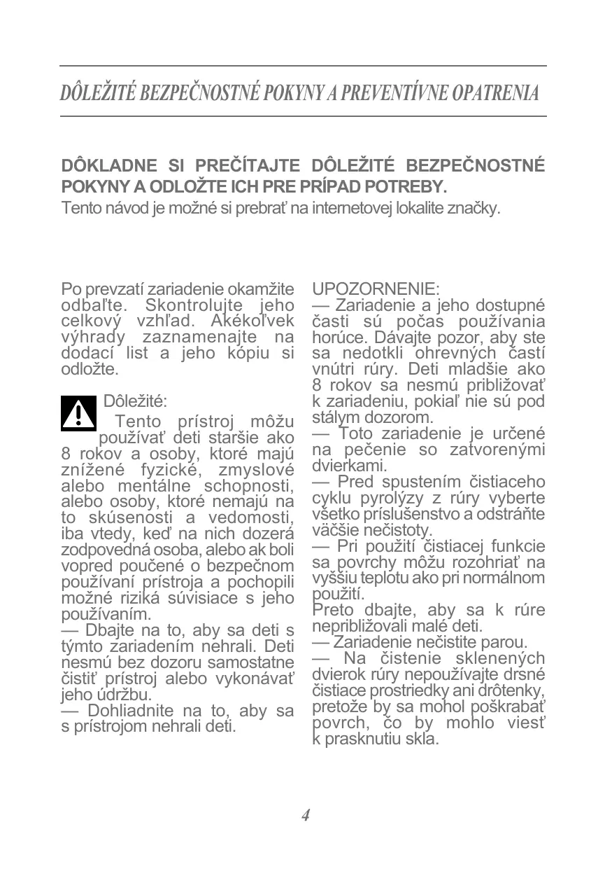 UPOZORNENIE: — Zariadenie a jeho dostupné časti sú počas používania horúce. Dávajte pozor, aby ste sa nedotkli ohrevných častí vnútri rúry. Deti mladšie ako 8 rokov sa nesmú približovať k zariadeniu, pokiaľ nie sú pod stálym dozorom. — Toto zariadenie je určené na pečenie so zatvorenými dvierkami. — Pred spustením čistiaceho cyklu pyrolýzy z rúry vyberte všetko príslušenstvo a odstráňte väčšie nečistoty. — Pri použití čistiacej funkcie sa povrchy môžu rozohriať na vyššiu teplotu ako pri normálnom použití. Preto dbajte, aby sa k rúre nepribližovali malé deti. — Zariadenie nečistite parou. — Na čistenie sklenených dvierok rúry nepoužívajte drsné čistiace prostriedky ani drôtenky, pretože by sa mohol poškrabať povrch, čo by mohlo viesť k prasknutiu skla.