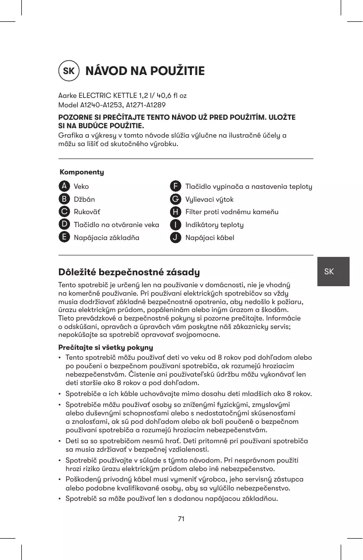 SK NÁVOD NA POUŽITIE Aarke ELECTRIC KETTLE 1,2 l/ 40,6 fl oz Model A1240-A1253, A1271-A1289 POZORNE SI PREČÍTAJTE TENTO NÁVOD UŽ PRED POUŽITÍM. ULOŽTE SI NA BUDÚCE POUŽITIE. Grafika a výkresy v tomto návode slúžia výlučne na ilustračné účely a môžu sa líšiť od skutočného výrobku.