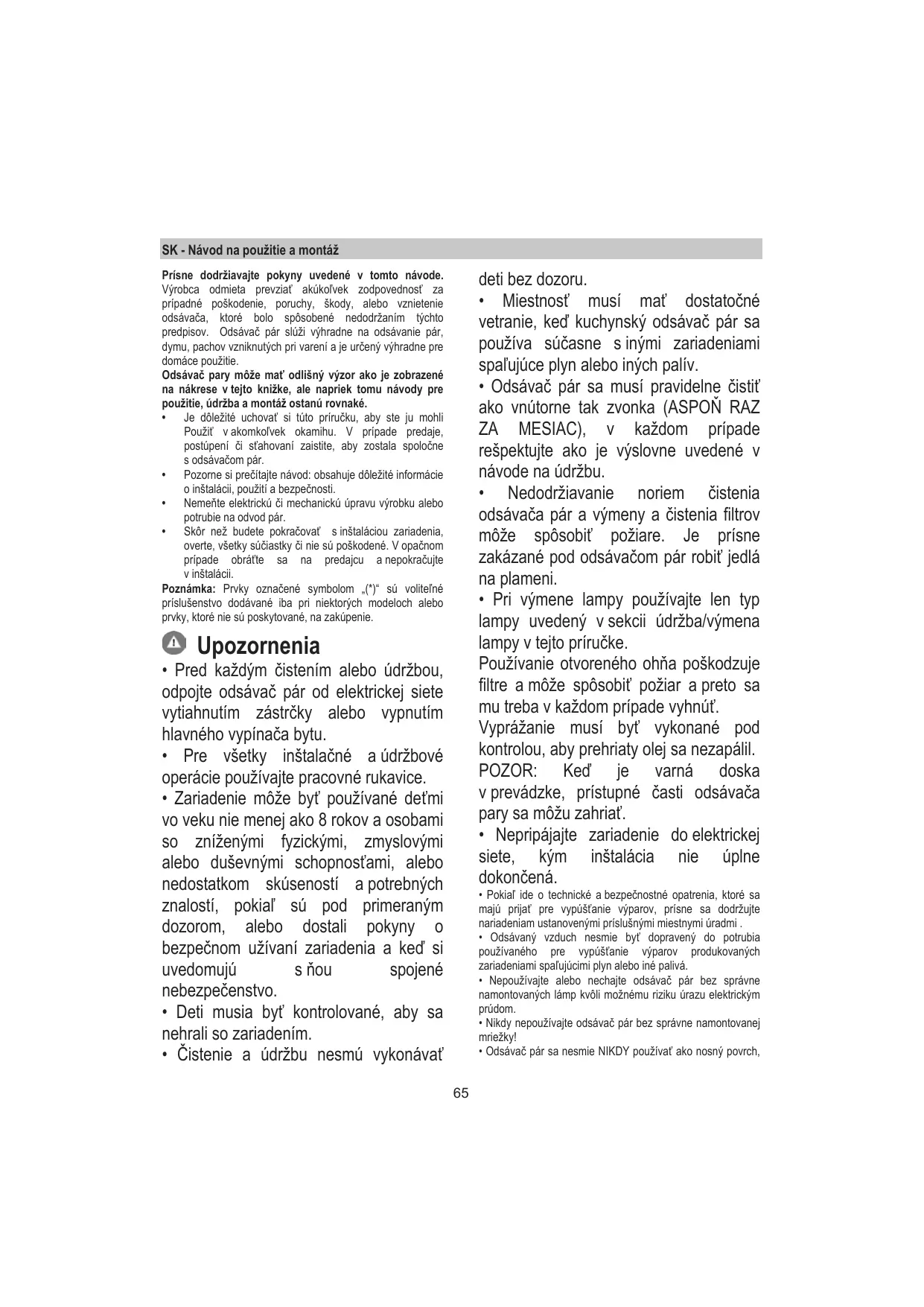 • Les enfants ne doivent pas jouer avec l’appareil. • Le nettoyage et l’entretien par l’usager ne doivent pas être effectués par des enfants sans surveillance. • La pièce doit avoir une aération suffisante lorsque la hotte est utilisée conjointement avec d'autres appareils fonctionnant au gaz ou autres combustibles. • La hotte doit être régulièrement nettoyée à la fois à l'intérieur et à l'extérieur (AU MOINS UNE FOIS PAR MOIS); cela devrait se faire en conformité avec les instructions d'entretien. Le non respect des instructions expressément fournies concernant le nettoyage de la hotte et des filtres peut provoquer des risques d'incendie. • Ne pas flamber d’aliments sous la hotte. • Pour le remplacement de la lampe, utilisez uniquement le type de lampe spécifié dans la section remplacement/maintenance lampe dans ce manuel. L'utilisation d'une flamme nue est dommageable pour les filtres et peut causer un incendie, par conséquent, il est déconseillé de l'utiliser. La friture doit être faite avec soin afin de s’assurer que l’huile surchauffée ne prenne pas feu. AVERTISSEMENT: Lorsque la table de cuisson est en fonctionnement, les parties accessibles de la hotte peuvent
