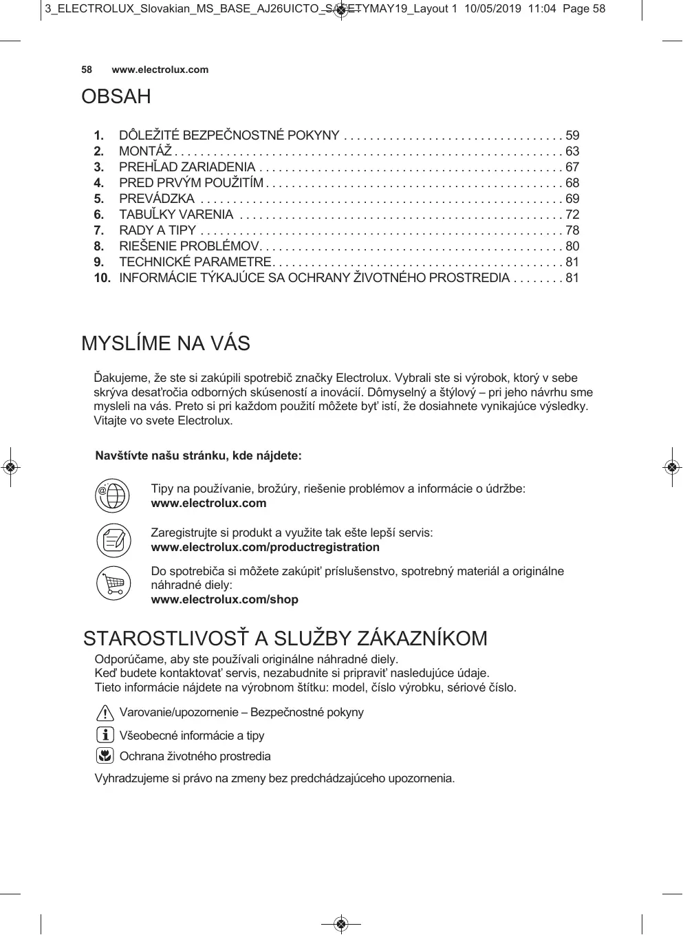 - inforMácie tÝkajúce sa ochrany životného prostreDia MyslíMe na vás Ďakujeme, že ste si zakúpili spotrebič značky electrolux. vybrali ste si výrobok, ktorý v sebe skrýva desaťročia odborných skúseností a inovácií. Dômyselný a štýlový – pri jeho návrhu sme mysleli na vás. preto si pri každom použití môžete byť istí, že dosiahnete vynikajúce výsledky. vitajte vo svete electrolux. Navštívte našu stránku, kde nájdete: tipy na používanie, brožúry, riešenie problémov a informácie o údržbe: www.electrolux.com zaregistrujte si produkt a využite tak ešte lepší servis: www.electrolux.com/productregistration Do spotrebiča si môžete zakúpiť príslušenstvo, spotrebný materiál a originálne náhradné diely: www.electrolux.com/shop starostlivosŤ a služby zákazníkoM odporúčame, aby ste používali originálne náhradné diely. keď budete kontaktovať servis, nezabudnite si pripraviť nasledujúce údaje. tieto informácie nájdete na výrobnom štítku: model, číslo výrobku, sériové číslo. varovanie/upozornenie – bezpečnostné pokyny všeobecné informácie a tipy ochrana životného prostredia vyhradzujeme si právo na zmeny bez predchádzajúceho upozornenia. 3_ELECTROLUX_Slovakian_MS_BASE_AJ26UICTO_SAFETYMAY19_Layout 1 10/05/2019 11:04 Page 59 SLOVENČINA p. 81
