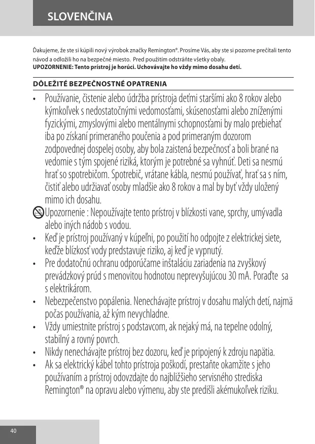 • Používanie, čistenie alebo údržba prístroja deťmi staršími ako 8 rokov alebo kýmkoľvek s nedostatočnými vedomosťami, skúsenosťami alebo zníženými fyzickými, zmyslovými alebo mentálnymi schopnosťami by malo prebiehať iba po získaní primeraného poučenia a pod primeraným dozorom zodpovednej dospelej osoby, aby bola zaistená bezpečnosť a boli brané na vedomie s tým spojené riziká, ktorým je potrebné sa vyhnúť. Deti sa nesmú hrať so spotrebičom. Spotrebič, vrátane kábla, nesmú používať, hrať sa s ním, čistiť alebo udržiavať osoby mladšie ako 8 rokov a mal by byť vždy uložený mimo ich dosahu. L Upozornenie : Nepoužívajte tento prístroj v blízkosti vane, sprchy, umývadla alebo iných nádob s vodou. • Keď je prístroj používaný v kúpeľni, po použití ho odpojte z elektrickej siete, keďže blízkosť vody predstavuje riziko, aj keď je vypnutý. • Pre dodatočnú ochranu odporúčame inštaláciu zariadenia na zvyškový prevádzkový prúd s menovitou hodnotou neprevyšujúcou 30 mA. Poraďte sa s elektrikárom. • Nebezpečenstvo popálenia. Nenechávajte prístroj v dosahu malých detí, najmä počas používania, až kým nevychladne. • Vždy umiestnite prístroj s podstavcom, ak nejaký má, na tepelne odolný, stabilný a rovný povrch. • Nikdy nenechávajte prístroj bez dozoru, keď je pripojený k zdroju napätia. • Ak sa elektrický kábel tohto prístroja poškodí, prestaňte okamžite s jeho používaním a prístroj odovzdajte do najbližšieho servisného strediska Remington® na opravu alebo výmenu, aby ste predišli akémukoľvek riziku. 40