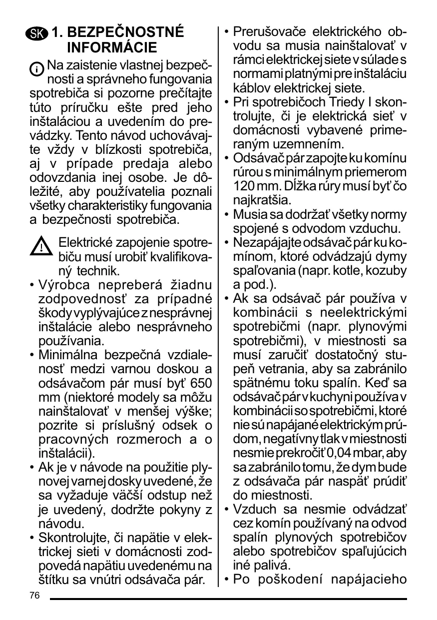 INFORMÁCIE Na zaistenie vlastnej bezpečnosti a správneho fungovania spotrebiča si pozorne prečítajte túto príručku ešte pred jeho inštaláciou a uvedením do prevádzky. Tento návod uchovávajte vždy v blízkosti spotrebiča, aj v prípade predaja alebo odovzdania inej osobe. Je dôležité, aby používatelia poznali všetky charakteristiky fungovania a bezpečnosti spotrebiča.