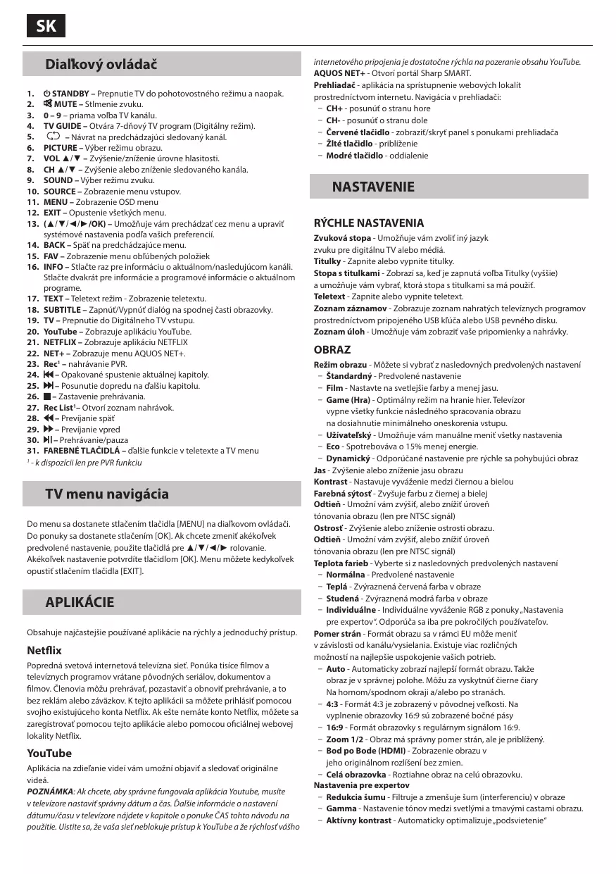 - k dispozícii len pre PVR funkciu TV menu navigácia Do menu sa dostanete stlačením tlačidla [MENU] na diaľkovom ovládači. Do ponuky sa dostanete stlačením [OK]. Ak chcete zmeniť akékoľvek predvolené nastavenie, použite tlačidlá pre ▲/▼/◄/► rolovanie. Akékoľvek nastavenie potvrdíte tlačidlom [OK]. Menu môžete kedykoľvek opustiť stlačením tlačidla [EXIT]. APLIKÁCIE Obsahuje najčastejšie používané aplikácie na rýchly a jednoduchý prístup. Netflix Popredná svetová internetová televízna sieť. Ponúka tisíce filmov a televíznych programov vrátane pôvodných seriálov, dokumentov a filmov. Členovia môžu prehrávať, pozastaviť a obnoviť prehrávanie, a to bez reklám alebo záväzkov. K tejto aplikácii sa môžete prihlásiť pomocou svojho existujúceho konta Netflix. Ak ešte nemáte konto Netflix, môžete sa zaregistrovať pomocou tejto aplikácie alebo pomocou oficiálnej webovej lokality Netflix. YouTube Aplikácia na zdieľanie videí vám umožní objaviť a sledovať originálne videá. POZNÁMKA: Ak chcete, aby správne fungovala aplikácia Youtube, musíte v televízore nastaviť správny dátum a čas. Ďalšie informácie o nastavení dátumu/času v televízore nájdete v kapitole o ponuke ČAS tohto návodu na použitie. Uistite sa, že vaša sieť neblokuje prístup k YouTube a že rýchlosť vášho internetového pripojenia je dostatočne rýchla na pozeranie obsahu YouTube. AQUOS NET+ - Otvorí portál Sharp SMART. Prehliadač - aplikácia na sprístupnenie webových lokalít prostredníctvom internetu. Navigácia v prehliadači: – CH+ - posunúť o stranu hore – CH- - posunúť o stranu dole – Červené tlačidlo - zobraziť/skryť panel s ponukami prehliadača – Žlté tlačidlo - priblíženie – Modré tlačidlo - oddialenie NASTAVENIE